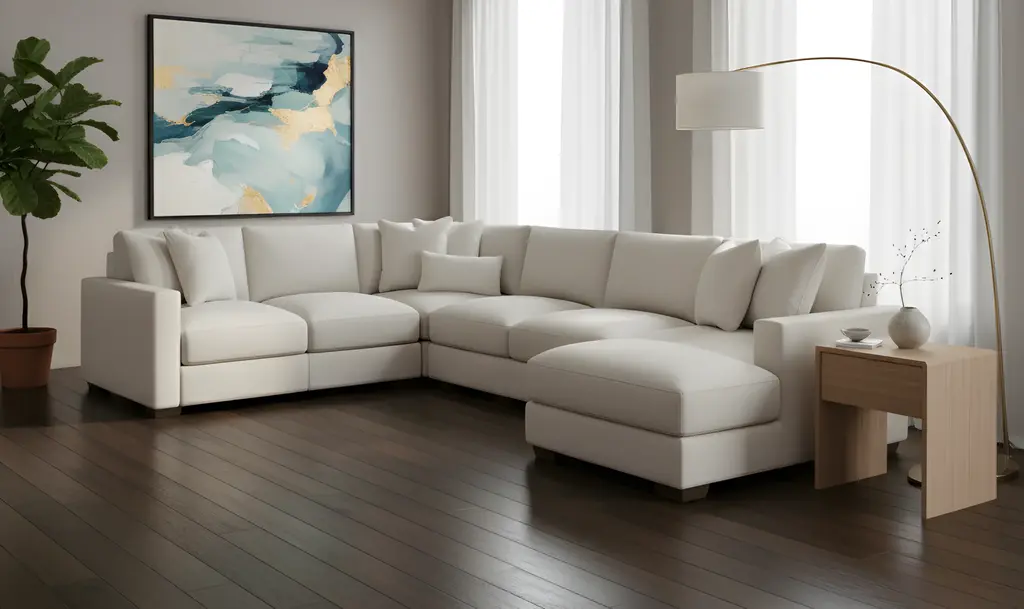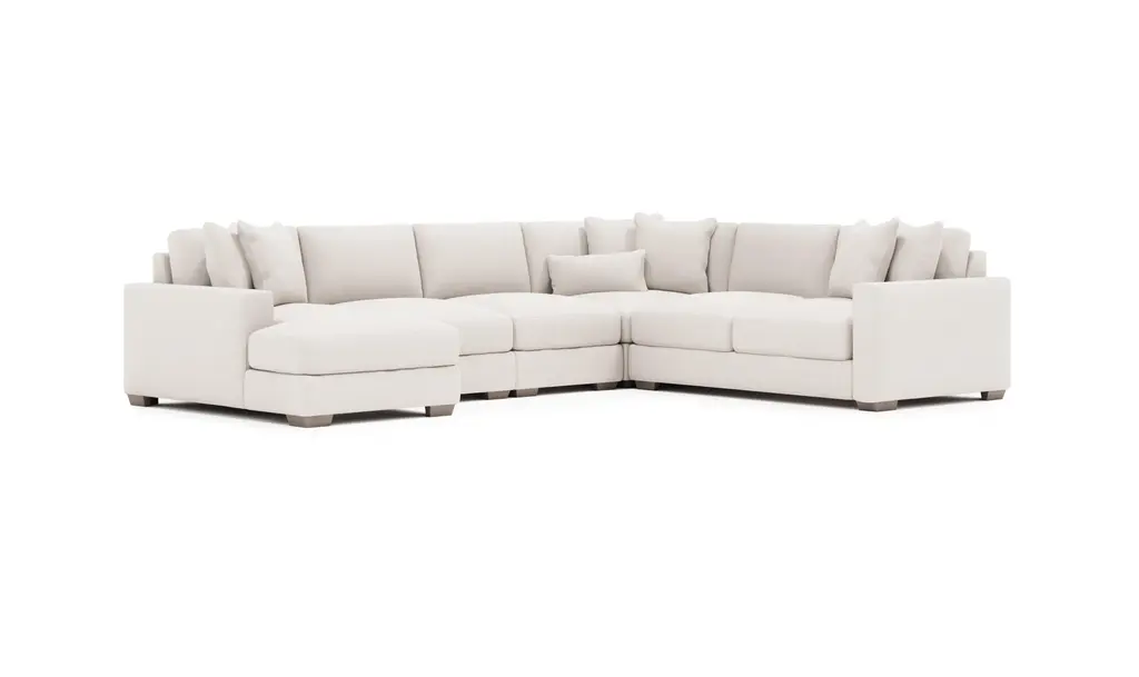 Introducing the Dawkins 5 Pieces Sectional with Chaise Đ a masterpiece in modern design and comfort. Crafted with a blend of luxurious fabric and leather, this sectional exudes sophistication with its relaxed tailoring and sumptuous cushions. The enduring appeal of this sectional lies in its timeless design, offering a perfect balance between style and comfort. This sectional sofa comes as a 5-piece ensemble, including a chaise for added relaxation. The set also includes 7 pillows, enhancing the overall plushness and providing support where you need it most. The track arms add a touch of contemporary elegance, making it a versatile addition to any living space. Not just a seating arrangement, the Dawkins Sectional is a statement piece with exposed wood legs and tapered legs that elevate its aesthetic. The loose pillows, along with the (7) fiber-filled, box-edge weltless border back pillows featuring topstitch detailing, contribute to the overall allure. Bring home the Dawkins 5 Pieces Sectional with Chaise for an exceptional blend of style, comfort, and enduring quality. Redefine your living space with this modern sectional that transcends trends and stands the test of time.Note:5 Pieces Includes: 2 x Armless Chair + Corner Chair + Right/Left Arm Chaise + Right/Left Arm Loveseat.