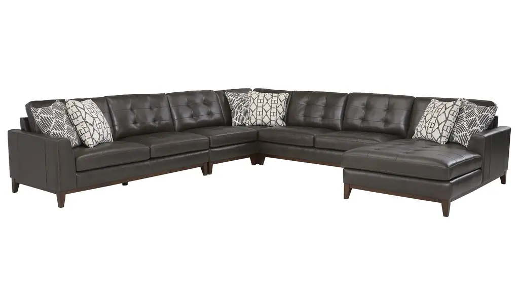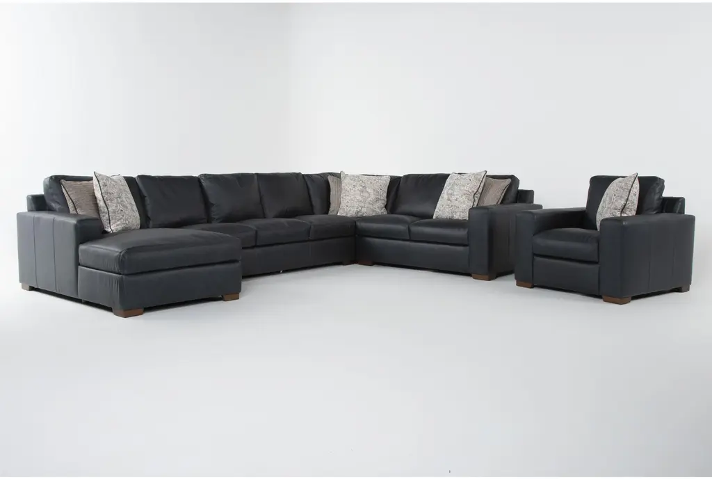 Introducing the Big Sur Blue Leather 169" 4 Piece U-Shaped Modular Sectional with Armless Sofa Right Arm Facing Chaise & Cocktail Ottoman. Designed for casual living, this sectional offers comfort and style in a versatile modular layout. Wrapped in luxurious volcano blue leather, it adds a touch of sophistication to any living room.