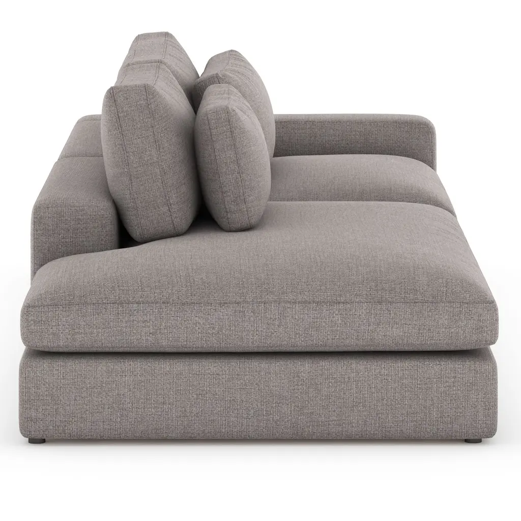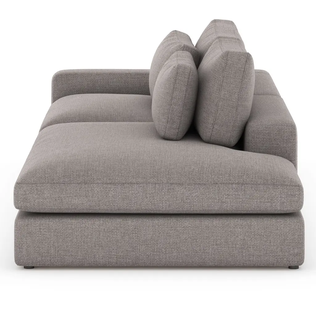 Deep, low seating says relax. A flexible, right arm-facing sectional is covered in an inviting, durable fabric in a textural pewter. Modular components allow the perfect combination for any space.