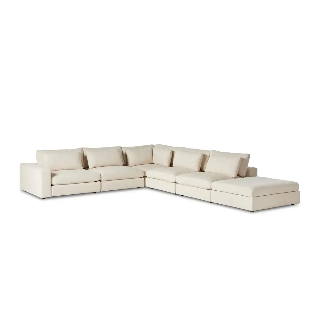Designed to be a haven for relaxation, the Bloor 5-Piece Sectional from Four Hands combines deep-seated comfort with a clean, tailored look. Crafted in Mexico, this expansive five-piece sectional features plush back cushions with a luxurious feather blend and supportive seats perfect for lounging. A perfect centerpiece for family gatherings, it offers an unmatched blend of livability and sophisticated style. Highlights: