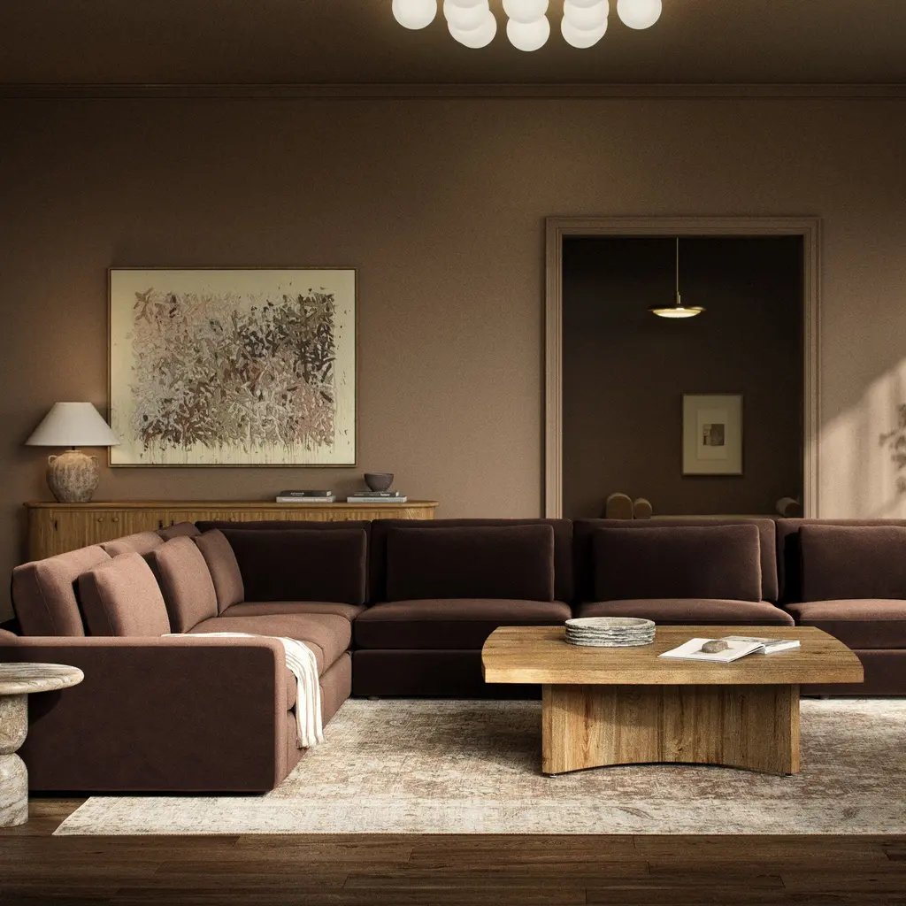 A stunning example of soft, sculptural minimalism, the Bloor 6-Piece Sectional from Four Hands makes a quiet yet confident statement. Its most striking feature is a floating, upholstered backrest that seems to hover, creating a sense of lightness and air. The solid wood frame features slender, rounded legs and a natural finish, beautifully complementing the richly textured fabric of the seat and back. Designed for both comfort and visual appeal, its organic curves and clean lines bring a serene, Japandi-inspired elegance to the modern dining room. Highlights: