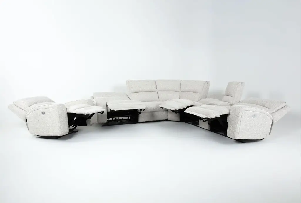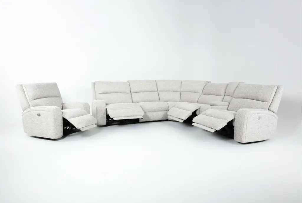 Experience ultimate comfort and style with the Brooks Grey 6 Piece Power Zero Gravity Modular Reclining Sectional. This left-facing sectional is designed to enhance your living room with its casual style and high-performance fabric in a haven newsprint color. Enjoy the convenience of adjustable headrests, a console with cupholders, and USB ports for all your relaxation needs.
