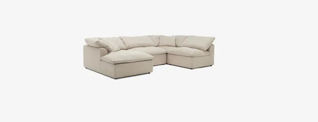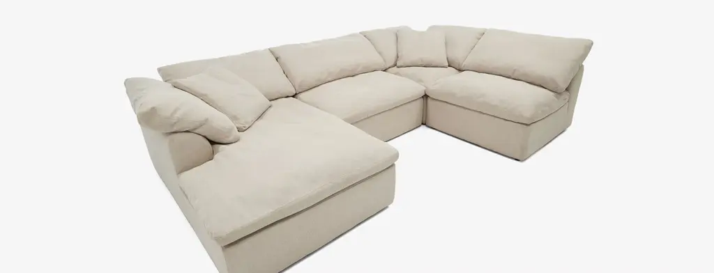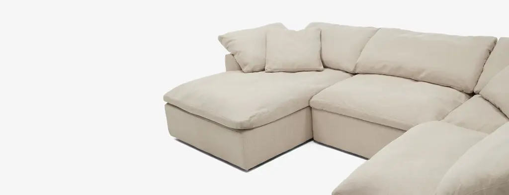 Maximize your legroom for parties, game nights, or simply stretching out, the Bryant Modular Double Chaise U-Sofa Bumper Sectional is sure to warm any living space with its laid-back modern style. Distinguished by its low-slung arms and pillowed backs, this sprawling sectional provides a snug sanctuary to any living space. Composed of a Double Chaise, Corner Chair, and two Armless Chairs.