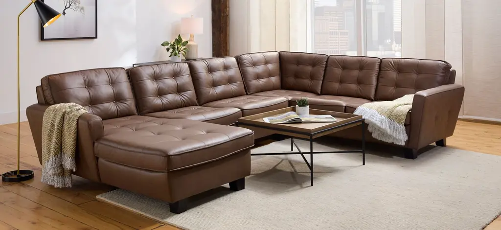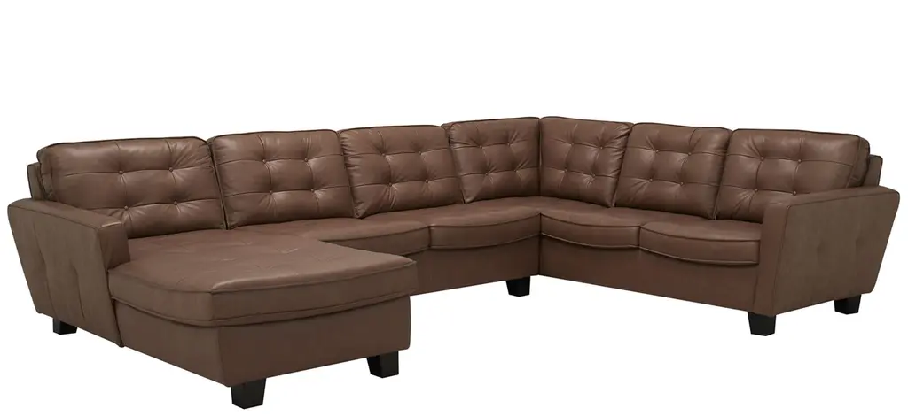 Relax with class on the Bryce 3-piece sectional. Soft brown leather seating is so inviting, particularly with its stylish track arms and button tufting. There's plenty of room to stretch out and unwind on the Bryce!Relax with class on the Bryce 3-piece sectional. Soft brown leather seating is so inviting, particularly with its stylish track arms and button tufting. There's plenty of room to stretch out and unwind on the Bryce!