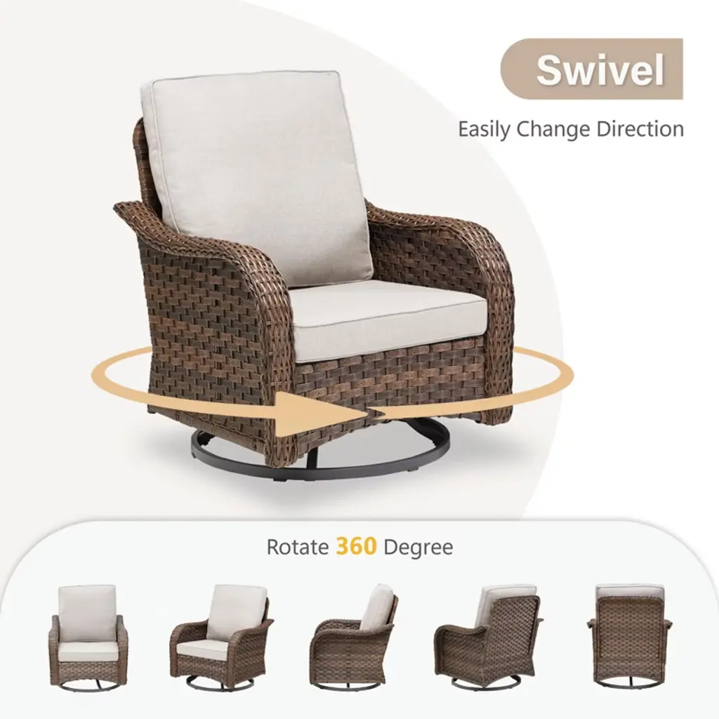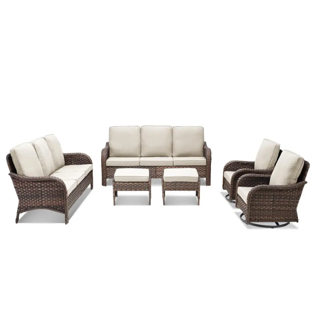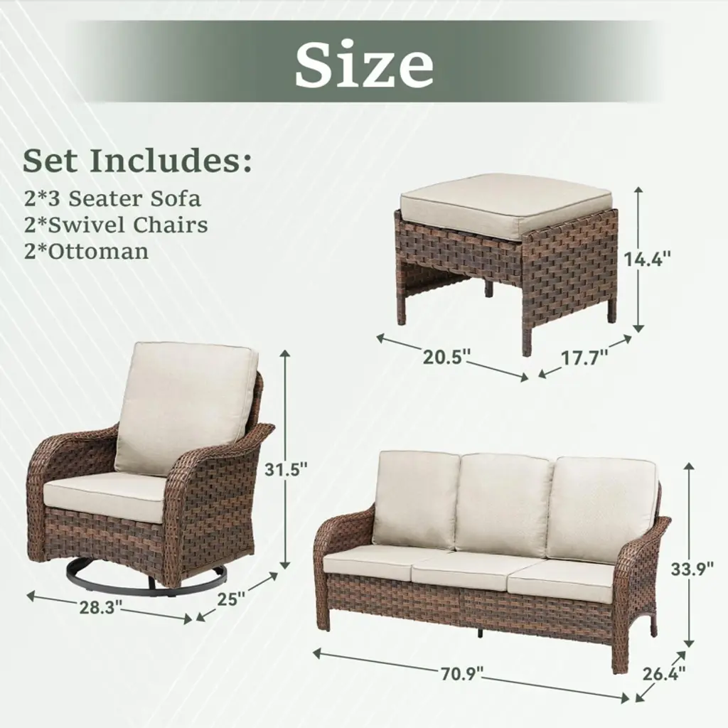Transform your outdoor space with our premium 6 Piece Patio Furniture Set! This complete wicker patio conversation set features 2 deep-seat sofas, 2 swivel chairs, and 2 ottomans - perfect for relaxing or entertaining. The 360¡ã rotating chairs with 350lb capacity and plush high-density cushions provide exceptional comfort, while the weather-resistant PE rattan and powder-coated frame ensure lasting durability. Easy to assemble and maintain, this stylish outdoor sofa set is ideal for patios, gardens, or poolside lounging!