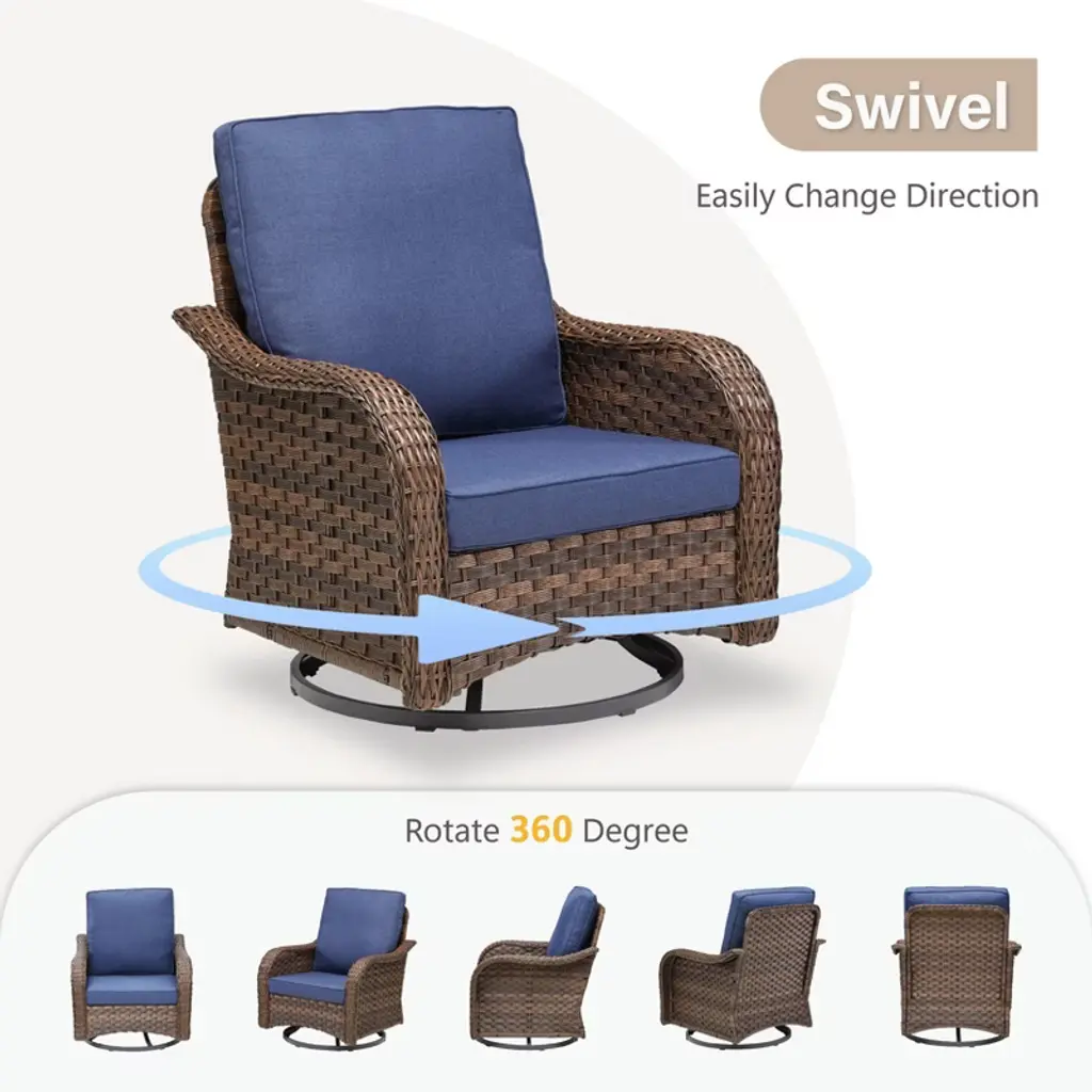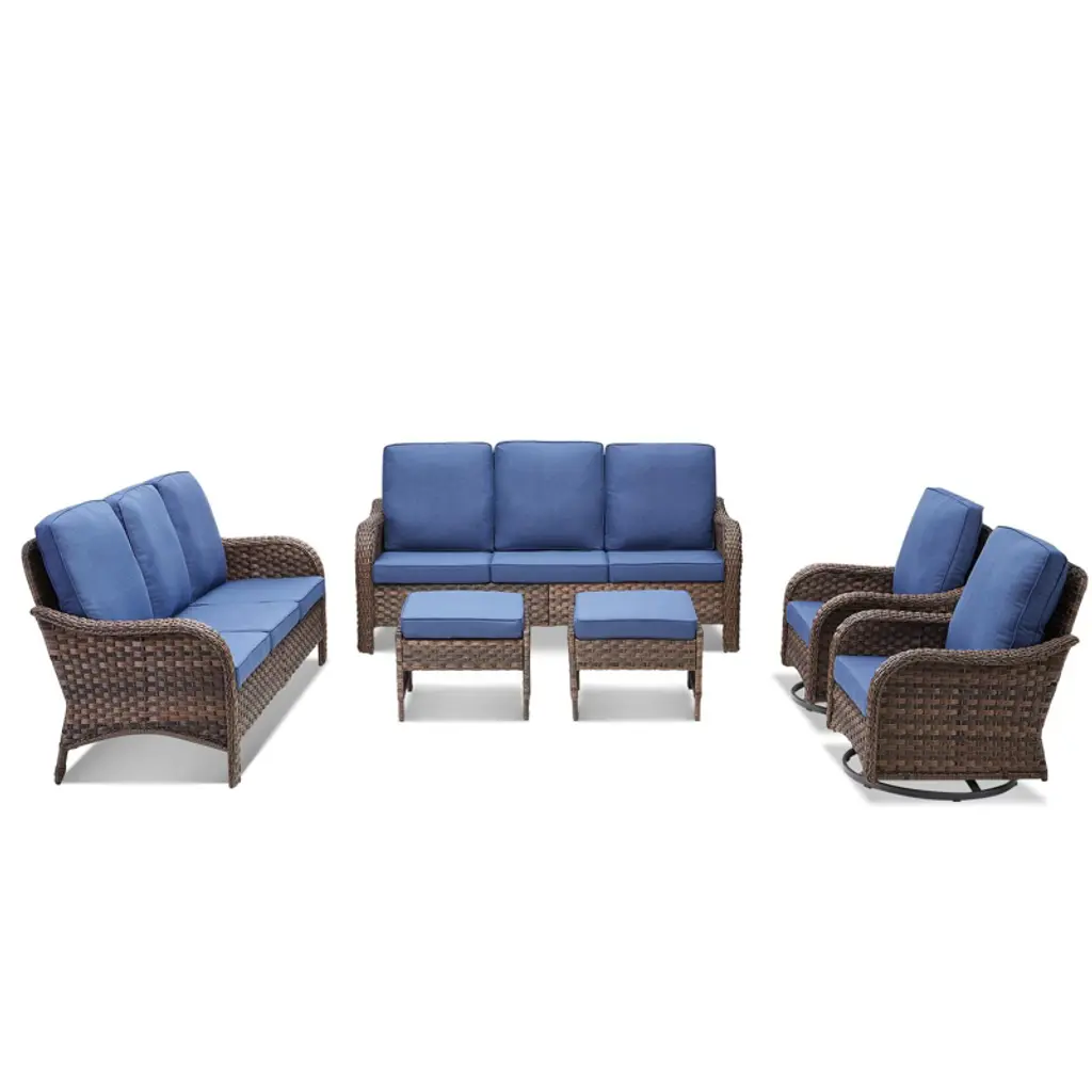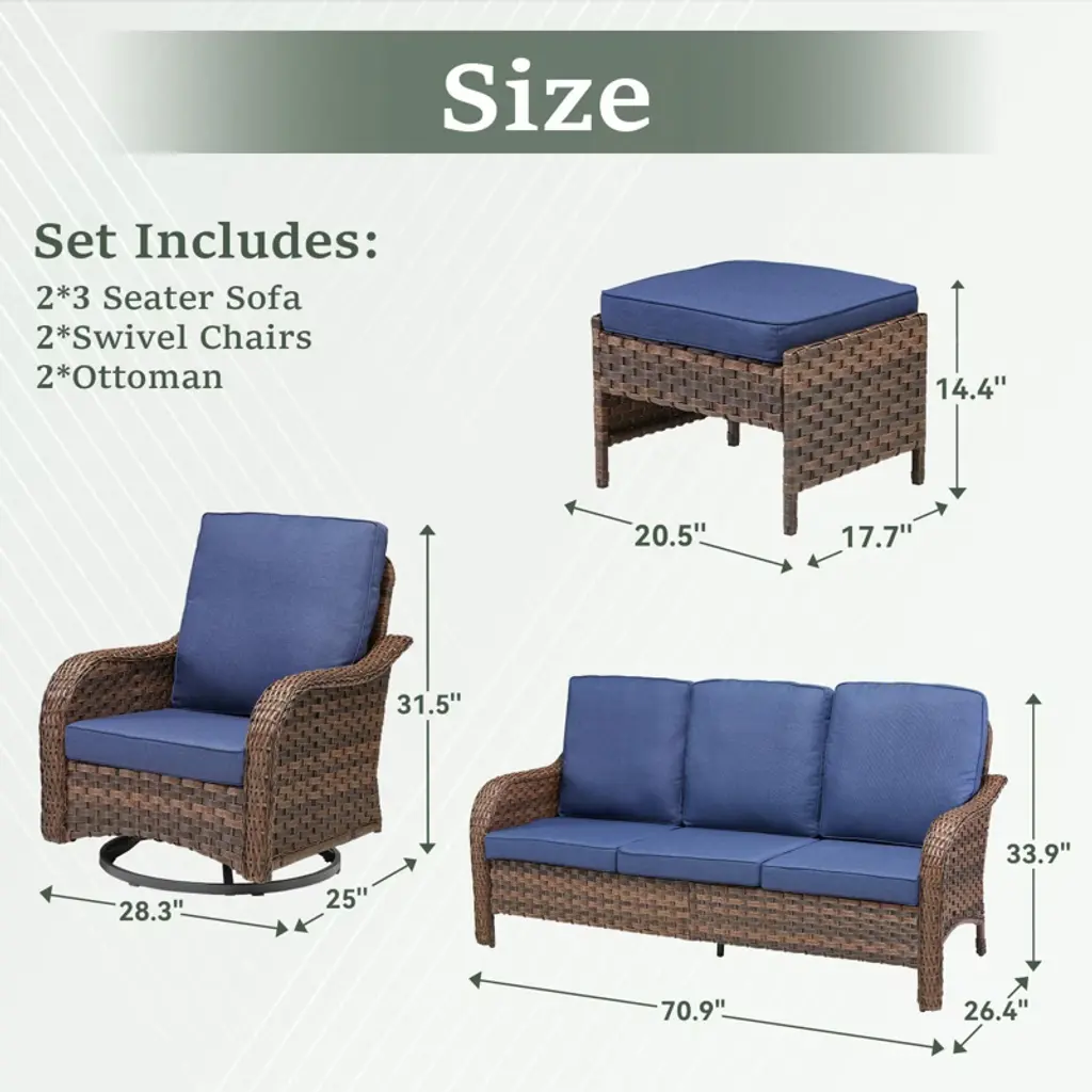 Transform your outdoor space with our premium 6 Piece Patio Furniture Set! This complete wicker patio conversation set features 2 deep-seat sofas, 2 swivel chairs, and 2 ottomans - perfect for relaxing or entertaining. The 360¡ã rotating chairs with 350lb capacity and plush high-density cushions provide exceptional comfort, while the weather-resistant PE rattan and powder-coated frame ensure lasting durability. Easy to assemble and maintain, this stylish outdoor sofa set is ideal for patios, gardens, or poolside lounging!
