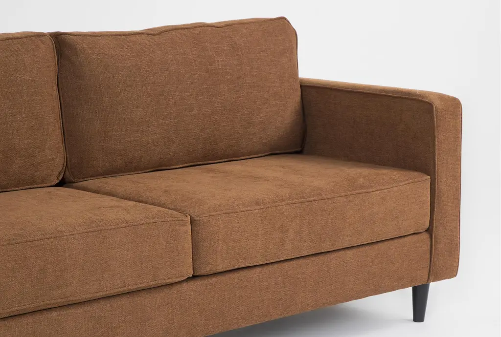 Introducing the Calais III Rust 108" 3 Piece Sectional, a stunning addition to your modern living room. This symmetrical sectional is designed for both style and comfort, featuring rust-colored fabric upholstery that adds warmth and sophistication to any space. With its track arms, tapered legs, and tight back, this piece is perfect for creating a cozy and inviting atmosphere.