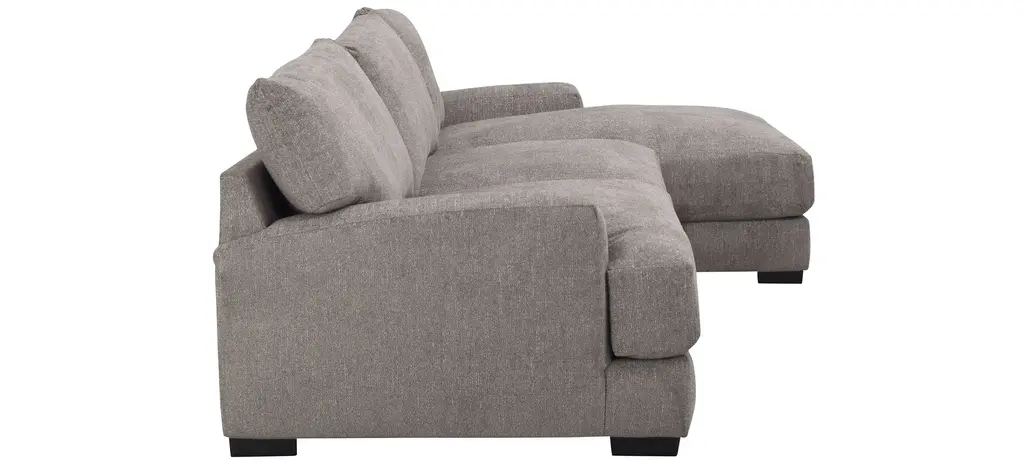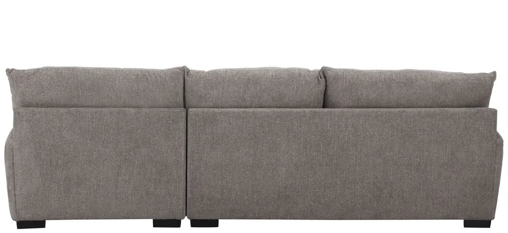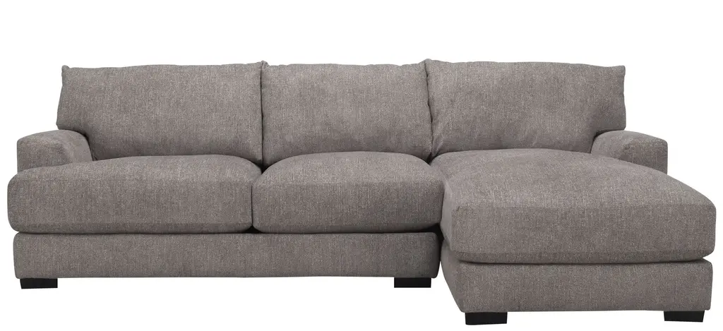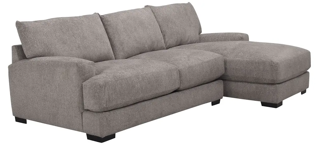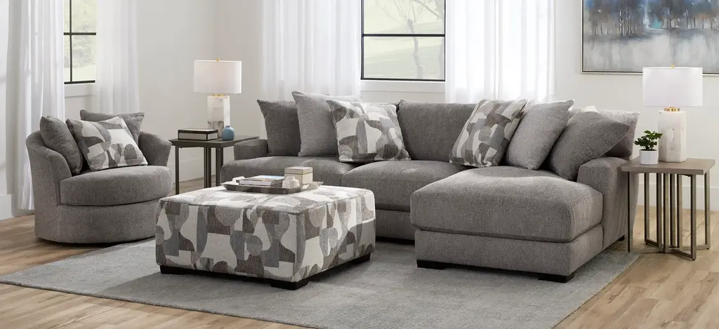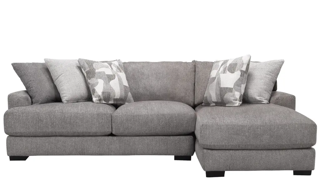 Comfortable on a grand scale, the Carter 2-pc. sectional makes the perfect cornerstone for a living space with family use at the forefront. The upholstery makes it cozy, easygoing and versatile, while the accent pillows give it a punch of graphic nostalgia. Ease onto the robust and plush waterfall seat cushions and you can happily sit or sprawl for hours on end. Pair this sectional with the on-trend accent chair and cocktail ottoman that echo the accent pillows for a professionally designed look.