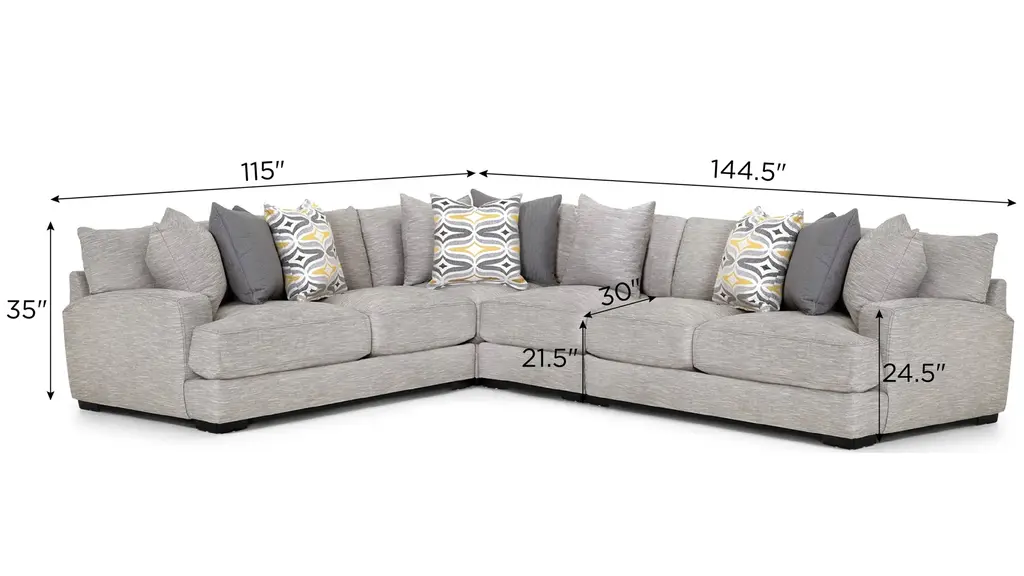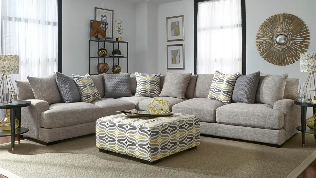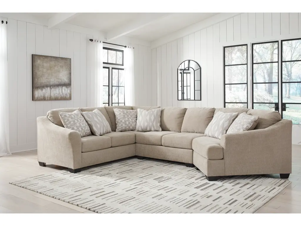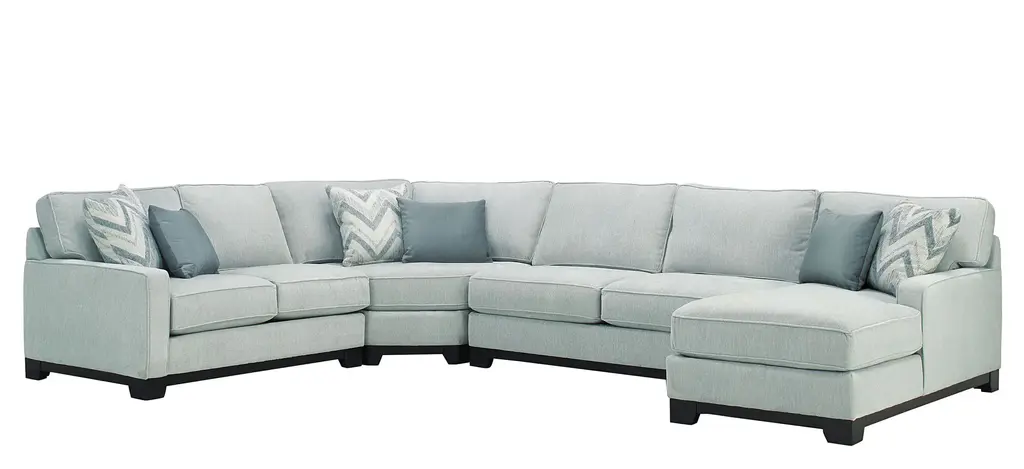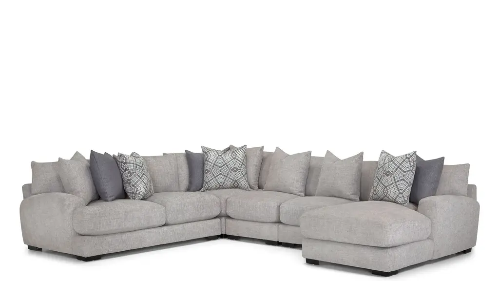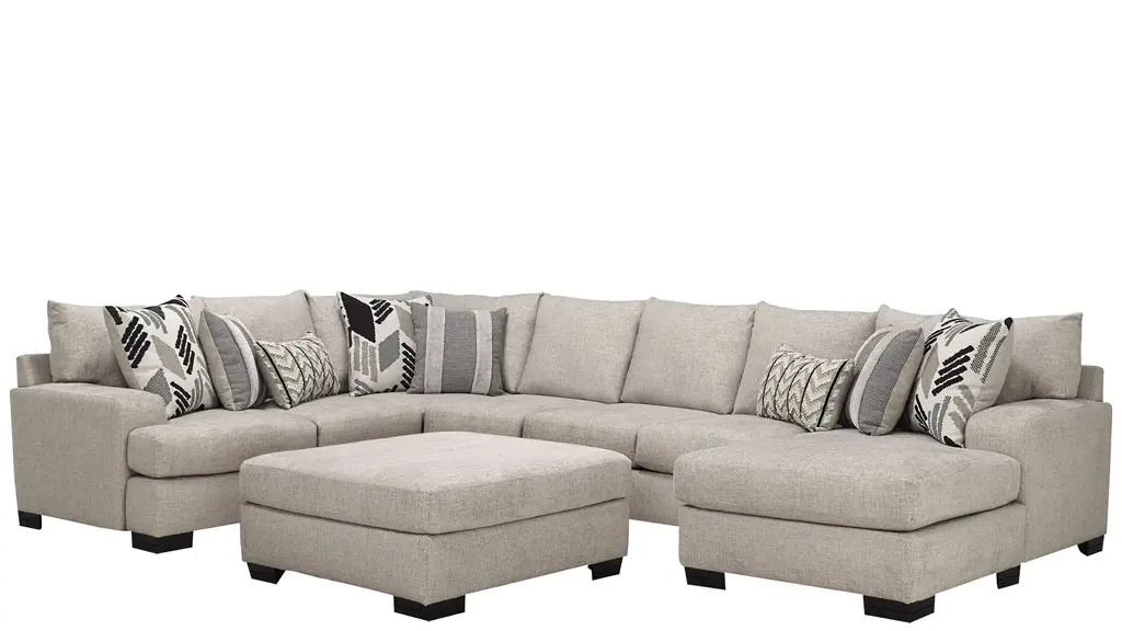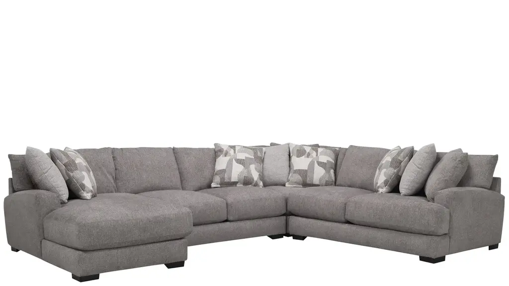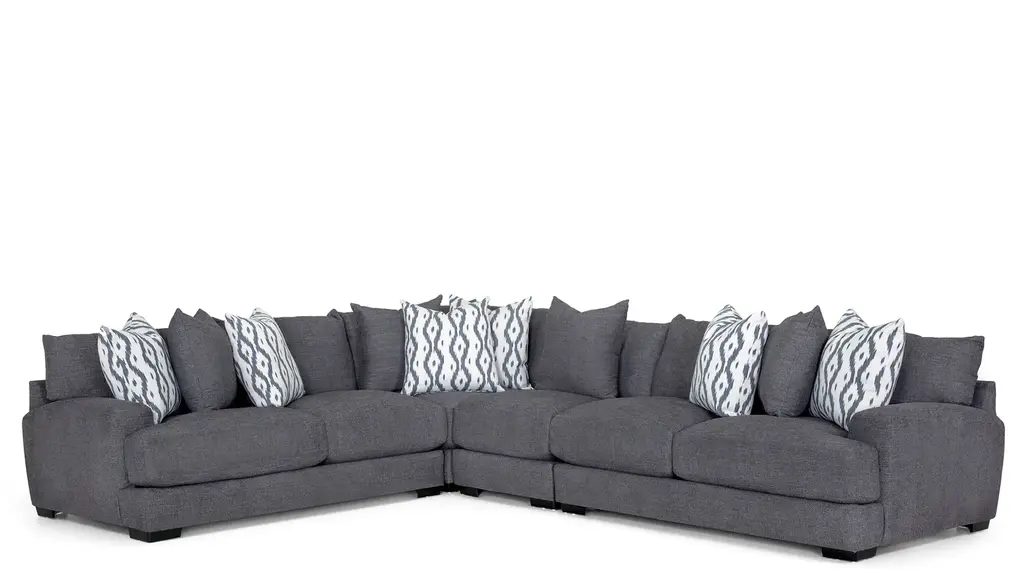 Comfortable on a grand scale, the Carter 4-pc. sectional makes the perfect cornerstone for a living space with family use at the forefront. The upholstery makes it cozy, easygoing and versatile, while the accent pillows give it a punch of graphic nostalgia. Ease onto the robust and plush waterfall seat cushions and you can happily sit or sprawl for hours on end.