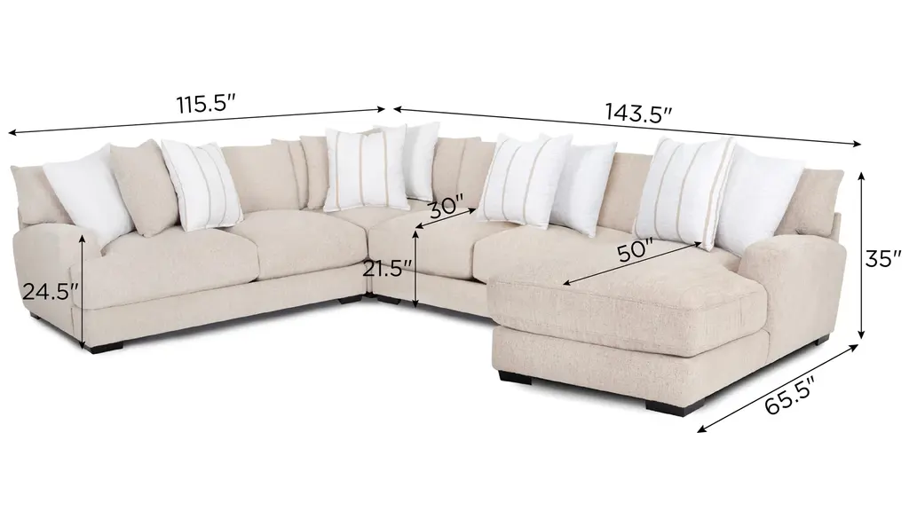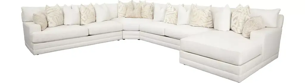 Comfortable on a grand scale, the Carter 4-pc. sectional makes the perfect cornerstone for a living space with family use at the forefront. The upholstery makes it cozy, easygoing and versatile, while the accent pillows give it a punch of graphic nostalgia. Ease onto the robust and plush waterfall seat cushions and you can happily sit or sprawl for hours on end.