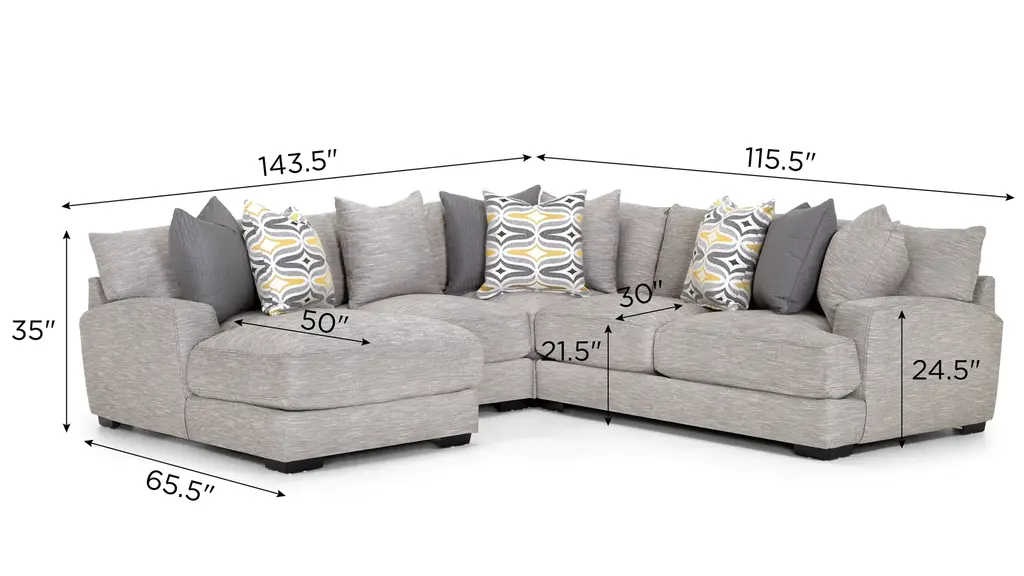 Comfortable on a grand scale, the Carter 4-pc. sectional makes the perfect cornerstone for a living space with family use at the forefront. The upholstery makes it cozy, easygoing and versatile, while the accent pillows give it a punch of graphic nostalgia. Ease onto the robust and plush waterfall seat cushions and you can happily sit or sprawl for hours on end.