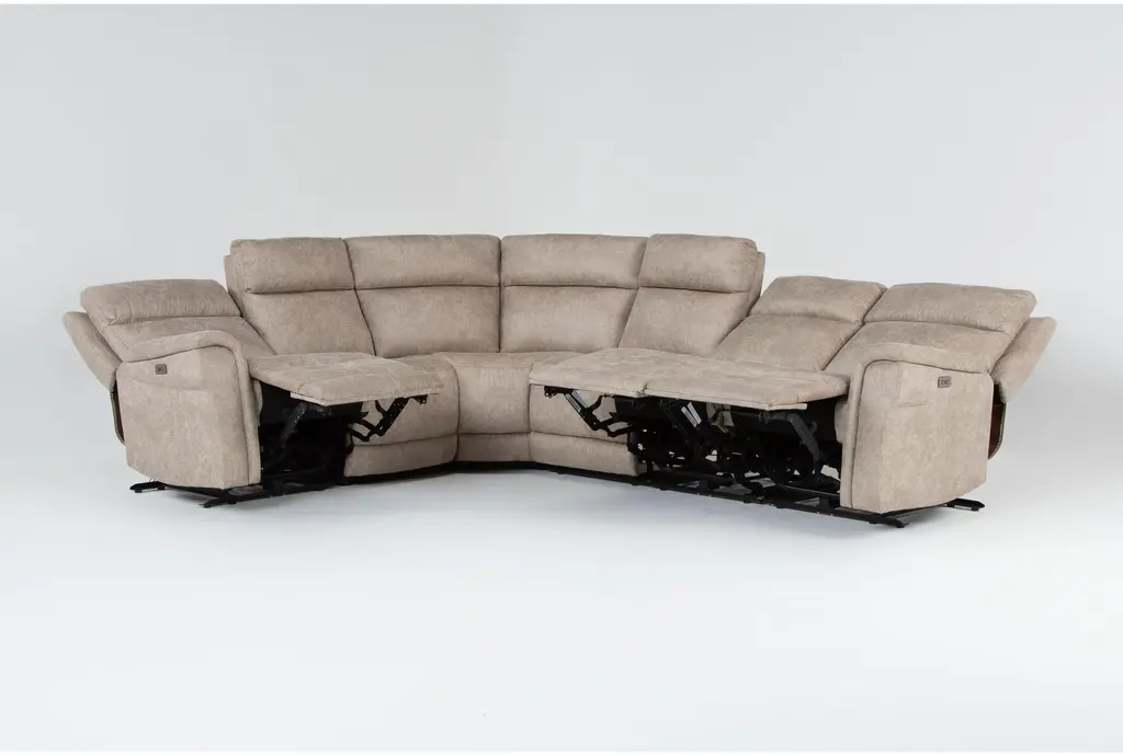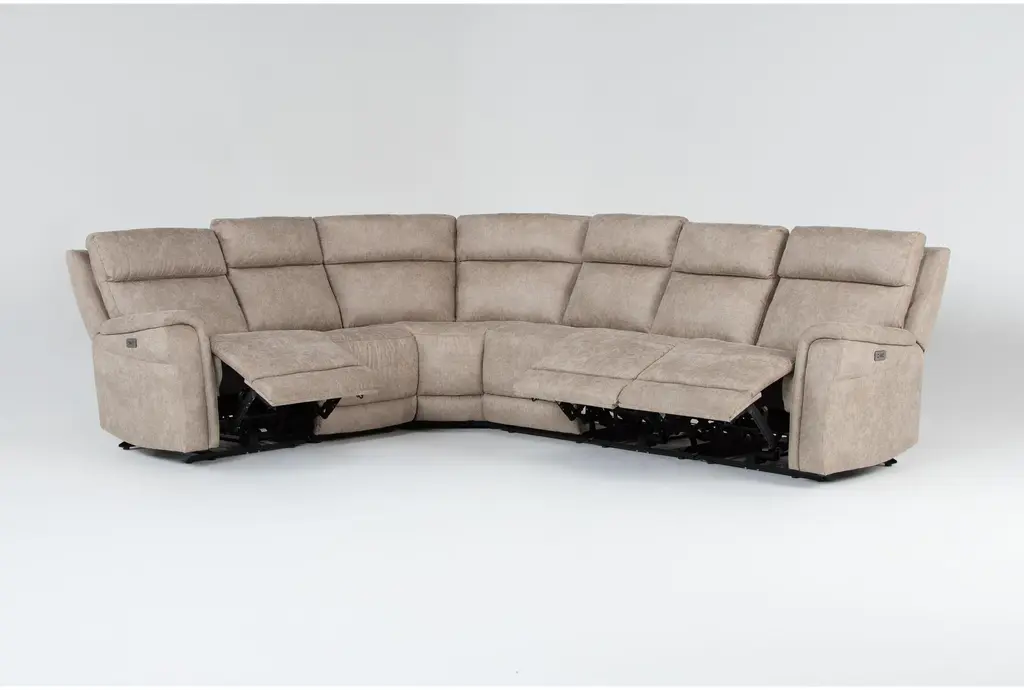 Experience the ultimate in comfort and versatility with the Caspian Natural Beige 129" 6 Piece Power Reclining Modular Sectional. Designed with a casual style, this L-shaped sectional offers the perfect combination of relaxation and functionality for your living room. The natural beige fabric and reversible orientation make it a timeless addition to any home.