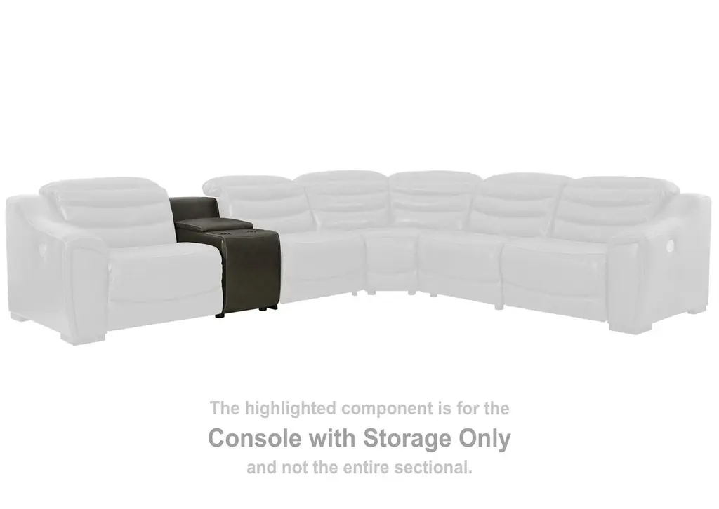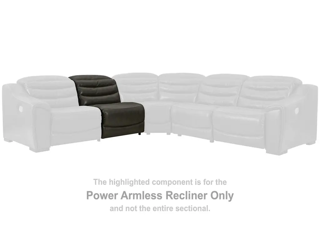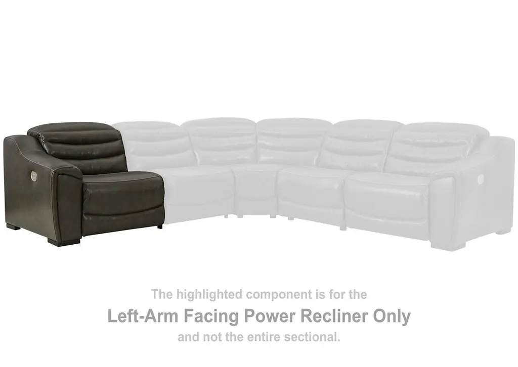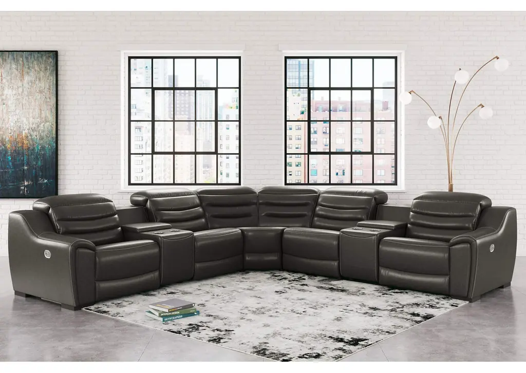 For those seeking to curate a living room retreat that offers superior comfort and a contemporary aesthetic, the sleekly designed Center Line power reclining sectional will become your favorite source of at-home serenity. Rest on expertly matched leather and faux leather upholstery, and use the one-touch power control to recline and adjust the headrests with ease. As you recharge after a long day, your devices can too with USB charging. This sectional is visually enticing in a luxe dark gray, with slope track arms and stitched detailing on the back to enhance its modern appeal. Weight 825.000 lbs. (371.25kgs.)