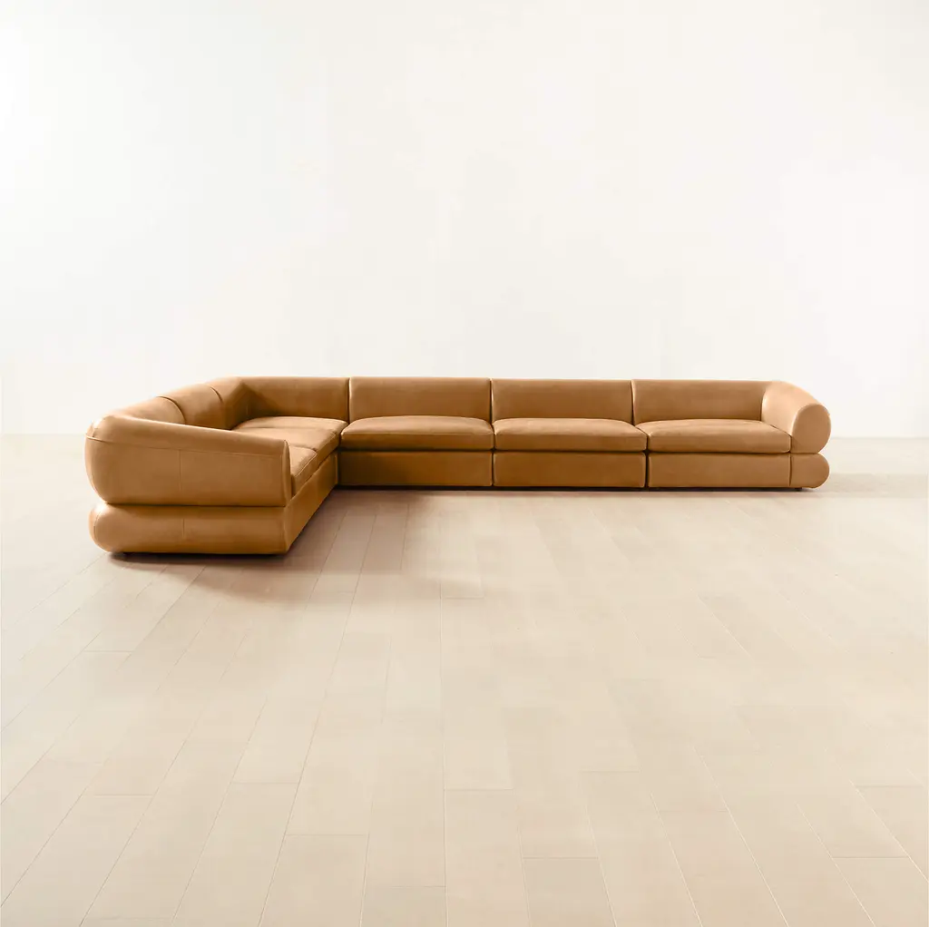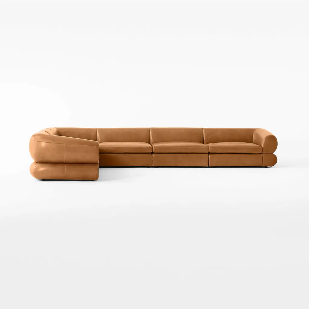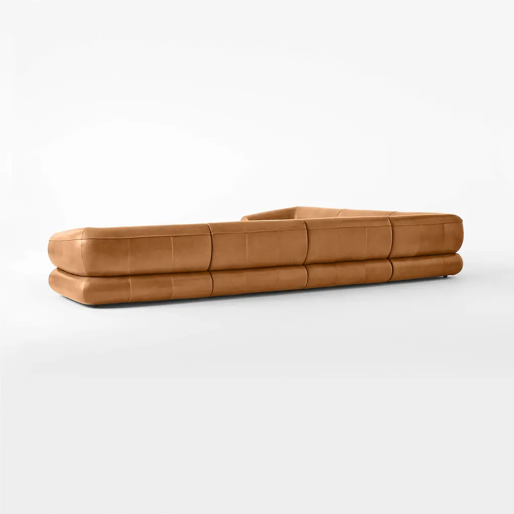 Designed in Barcelona by Mermelada Estudio, brown leather sectional sofa is spacious, low and loungey. Its soft, sloping arm and rounded silhouette borrow from '70s Italian design, while deep-seated cushioning is the pinnacle of modern comfort and style. Imported from Thailand, the Moore & Giles leather is known for its quality and is meticulously waxed by hand for an authentically worn feel. CB2 exclusive.