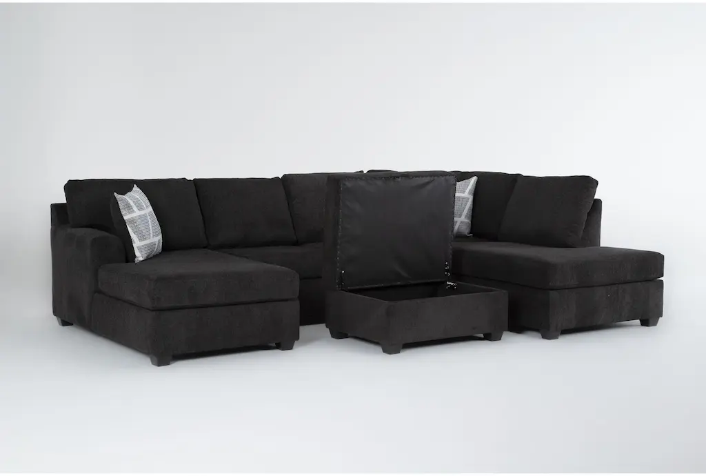 Colby Smoke Grey Black Fabric 128" 3 Piece U-Shaped Sectional With Left Arm Facing Chaise & Right Arm Facing Corner Chaise & Storage Ottoman
