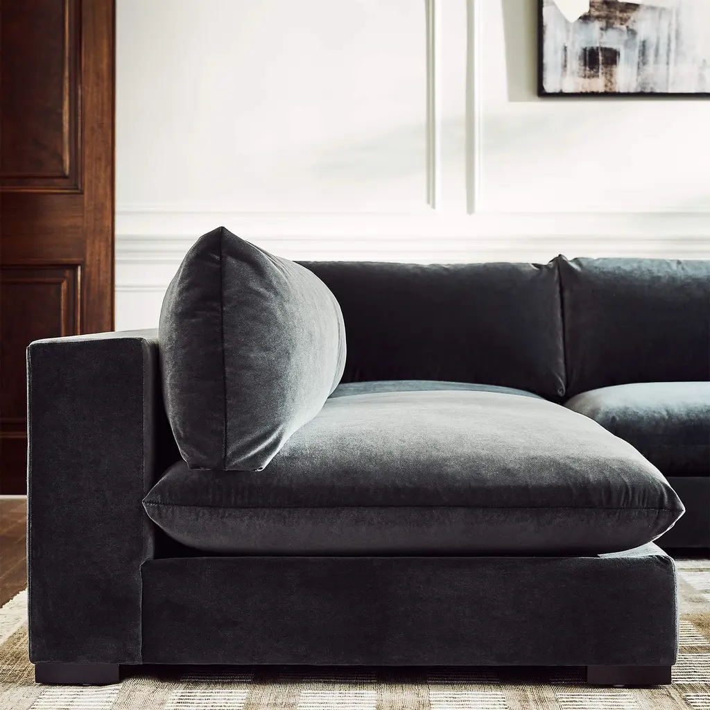 Upholstered in a charcoal performance velvet, large-scale sectional sits low to the ground for modern appeal. The plush silhouette features pillow-like detached cushions with broad armrests that can serve as a relaxed perch for socializing. Sectional pieces can be configured to suit your space. CB2 exclusive.