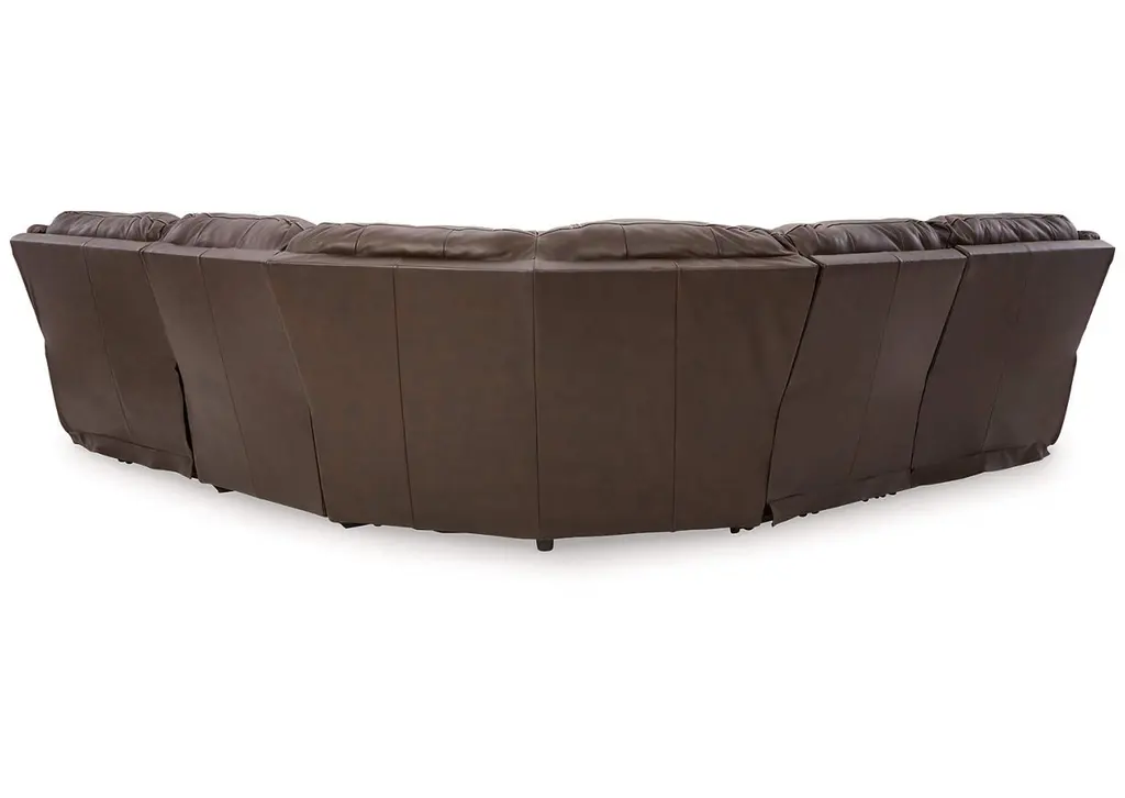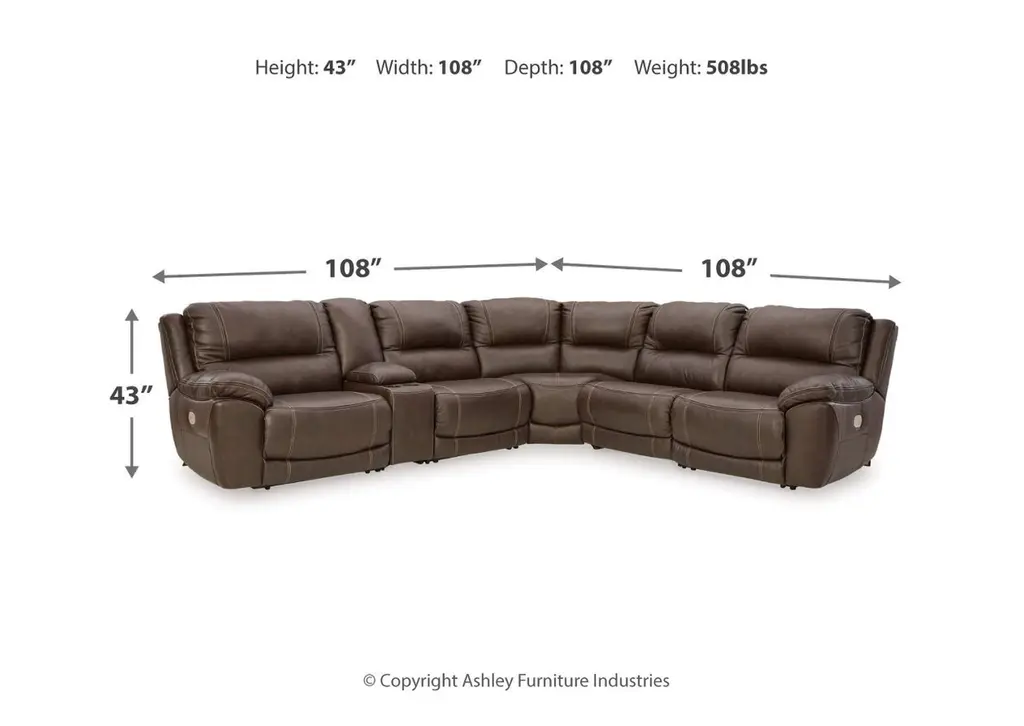 Load up on comfort in a cool, clean-lined and contemporary way with the Dunleith power reclining sectional in chocolate brown. Rest assured, the expertly matched leather and faux leather upholstery is enriched with a pebble grain effect for authentic appeal and enhanced with jumbo stitching for dramatic contrast. It features a one-touch power control with adjustable positions, along with an Easy View™ adjustable headrest that allows a primo view of the TV even when you're reclined. Extended ottomans provide extra length for leg comfort. A zero-draw USB plug-in at your fingertips lets you charge up as you chill out. Weight 508.000 lbs. (228.6kgs.)