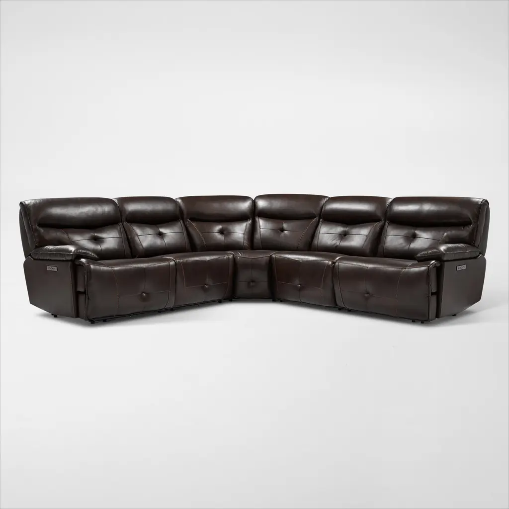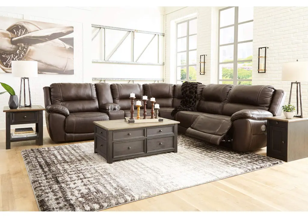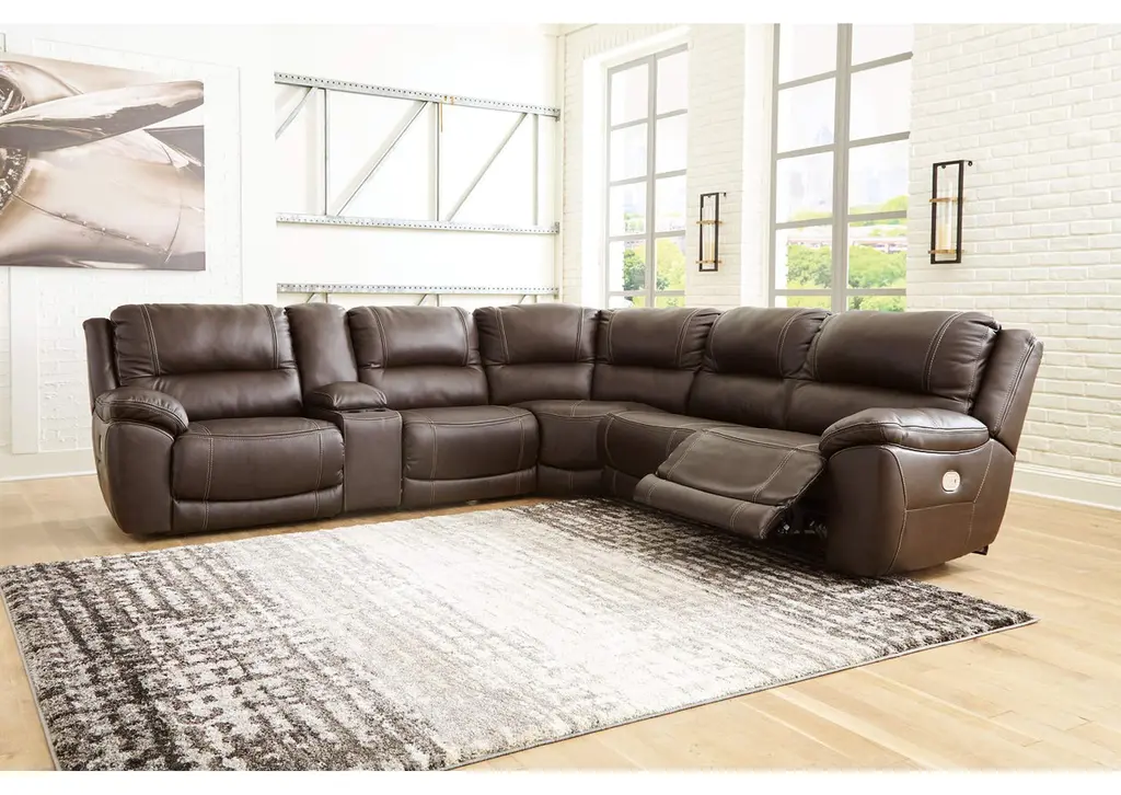 Load up on comfort in a cool, clean-lined and contemporary way with the Dunleith power reclining sectional in chocolate brown. Rest assured, the expertly matched leather and faux leather upholstery is enriched with a pebble grain effect for authentic appeal and enhanced with jumbo stitching for dramatic contrast. It features a one-touch power control with adjustable positions, along with an Easy View™ adjustable headrest that allows a primo view of the TV even when you're reclined. Extended ottomans provide extra length for leg comfort. A zero-draw USB plug-in at your fingertips lets you charge up as you chill out. Weight 544.000 lbs. (244.8kgs.)