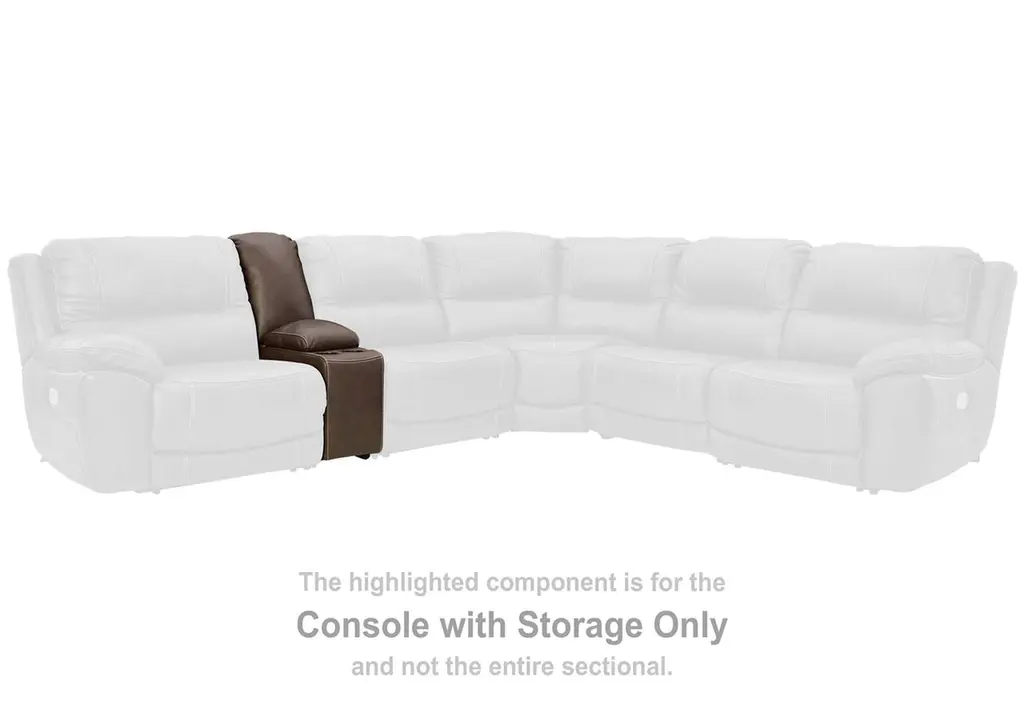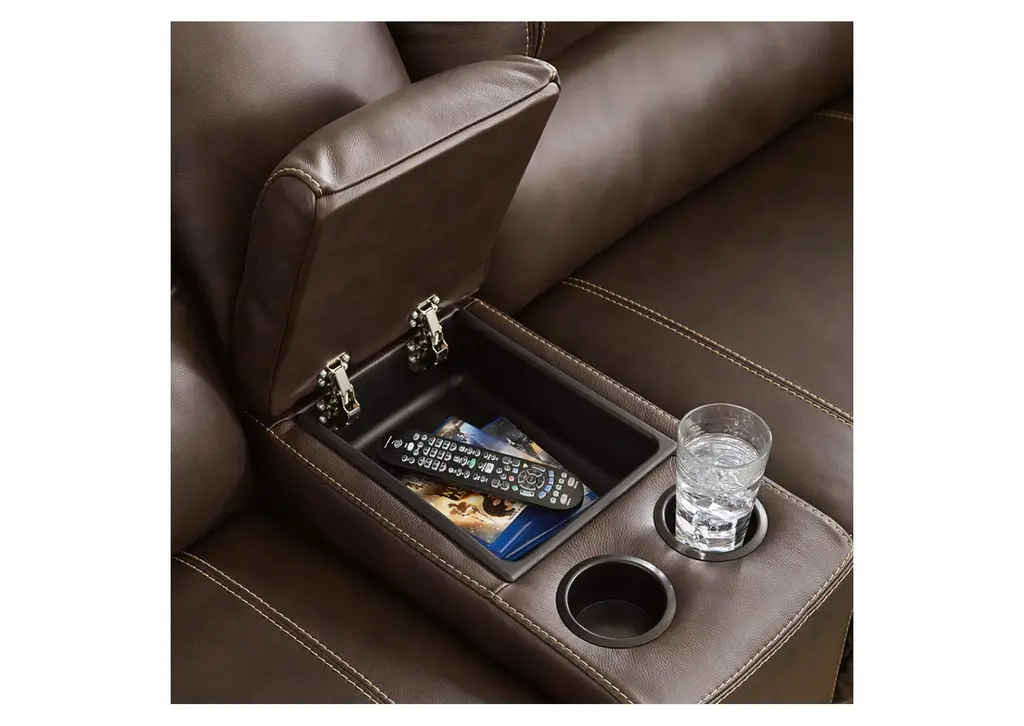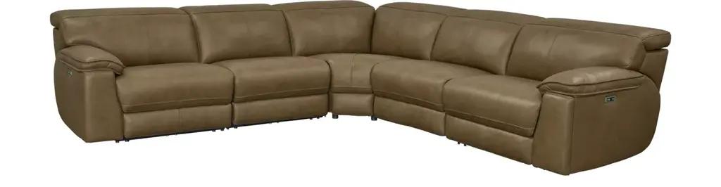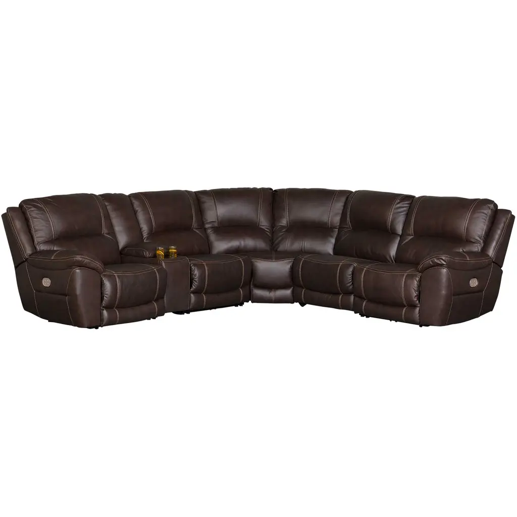 Load up on comfort in a cool, clean-lined and contemporary way with the Dunleith power reclining sectional in chocolate brown. Rest assured, the expertly matched leather and faux leather upholstery is enriched with a pebble grain effect for authentic appeal and enhanced with jumbo stitching for dramatic contrast. It features a one-touch power control with adjustable positions, along with an Easy View™ adjustable headrest that allows a primo view of the TV even when you're reclined. Extended ottomans provide extra length for leg comfort. A zero-draw USB plug-in at your fingertips lets you charge up as you chill out. Weight 580.000 lbs. (261kgs.)