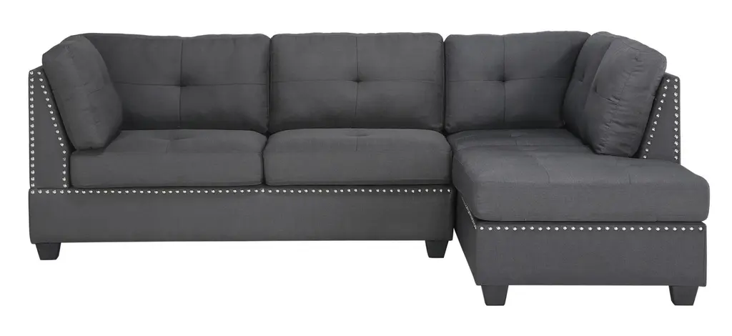 Providing ample seating space for your home's living room is the Edelweiss 2-piece sectional sofa. The clean lines of the sectional's profile lend perfectly to your transitional to traditional decor choices. Comfort comes in the form of the tufted cushion backs and seats. Nailhead accent on the track style arms and a dark charcoal gray fabric cover further lend to the versatile styling.Providing ample seating space for your home's living room is the Edelweiss 2-piece sectional sofa. The clean lines of the sectional's profile lend perfectly to your transitional to traditional decor choices. Comfort comes in the form of the tufted cushion backs and seats. Nailhead accent on the track style arms and a dark charcoal gray fabric cover further lend to the versatile styling.
