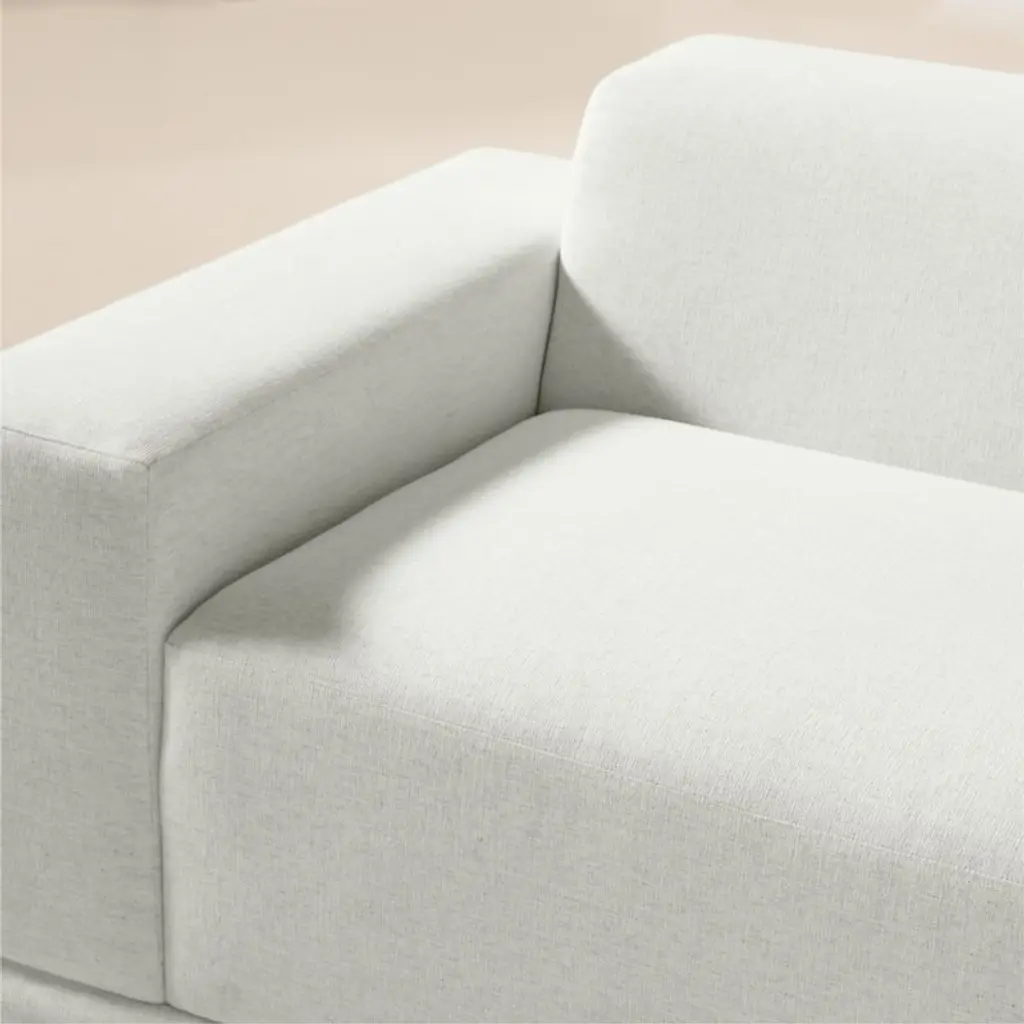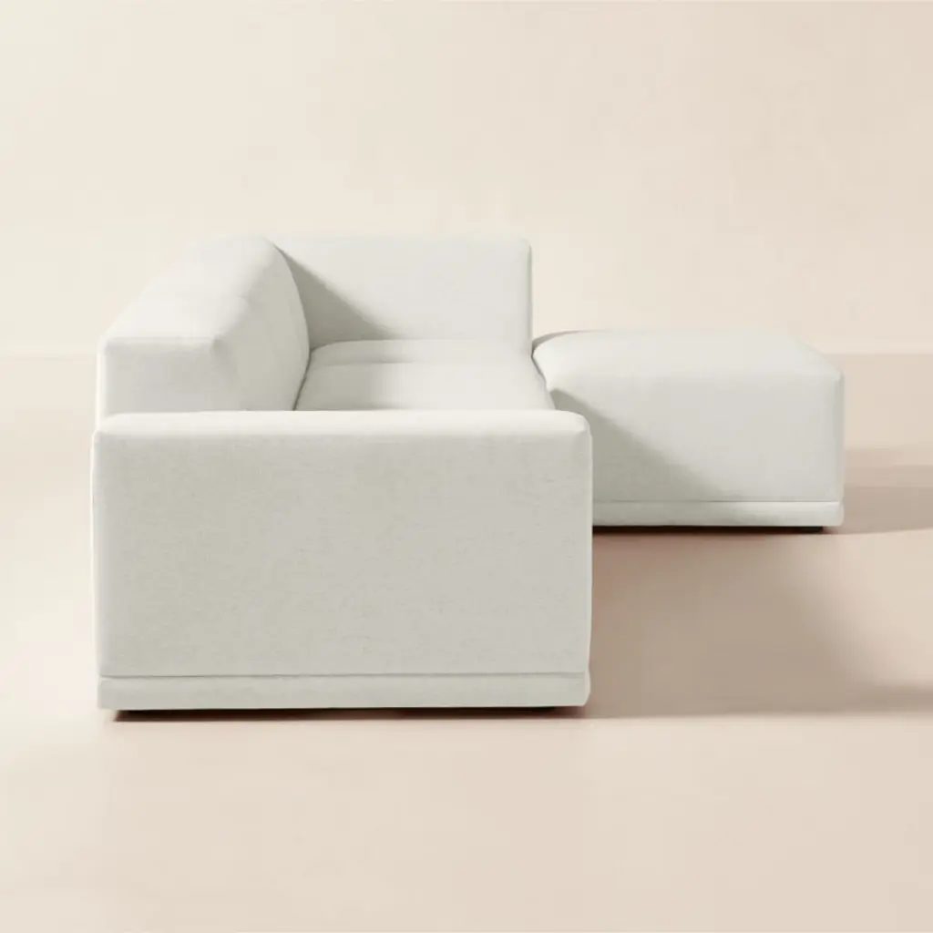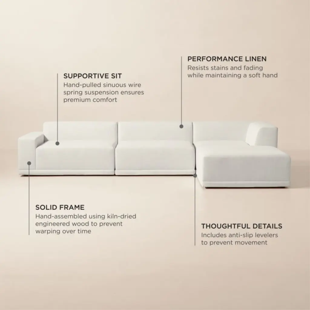 Hand-assembled in North Carolina, sectional sofa by Melbourne-based design studio VUUE is sophisticated in white. Upholstered in a soft linen-blend performance fabric that can withstand spills and other stressors while retaining the lushness of a high-end textile. Customize the sectional layout to suit your individual space. CB2 exclusive.