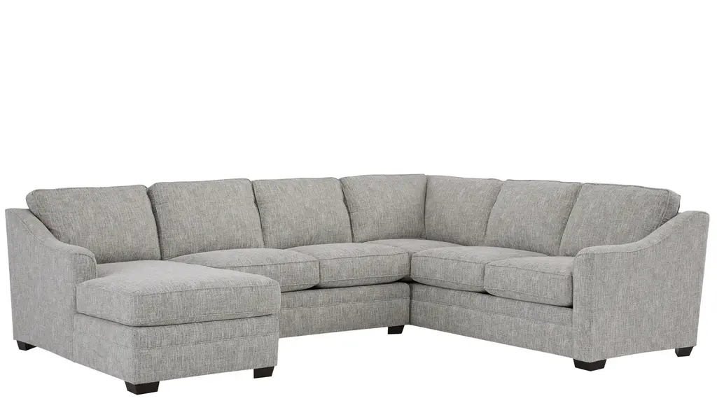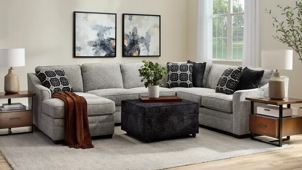A standard sectional gets an upscale update in the Fairhaven collection, with options for conversation corners, chaise lounging, or both. Featuring a transitional style with cool neutral upholstery, the Fairhaven 3-pc. sectional is beautiful tucked in a cozy corner or featured as a defining focal point in an open-concept living space. Striking textured accent pillows add dramatic pops of black and white for a designer touch.