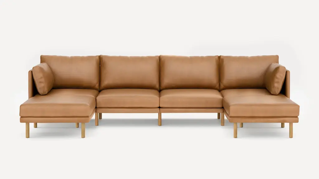 The Field Leather 5-Piece One Arm Sectional Lounger Sofa is an asymmetric corner sectional from our Field Collection. It features an open lounger seat at one end, allowing you to stretch out and relax. This modular couch can adapt to a wide spectrum of styles and can expand to accommodate your space in the future with additional modules. Deeper seats, plush cushions, and top-grain Italian leather are the defining characteristics of this piece. Continue scrolling to unveil its full story. | Burrow Field Leather 5-Piece One Arm Sectional Sofa Lounger