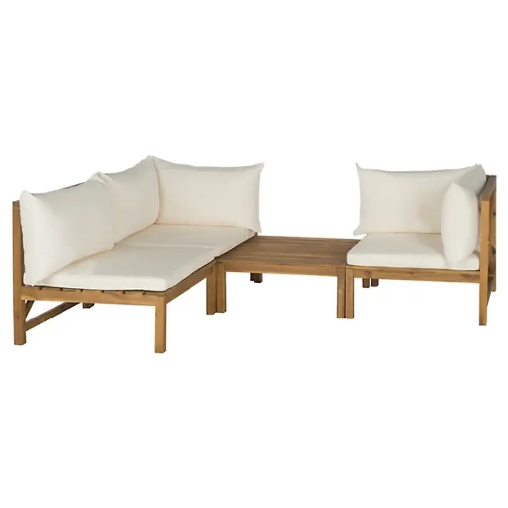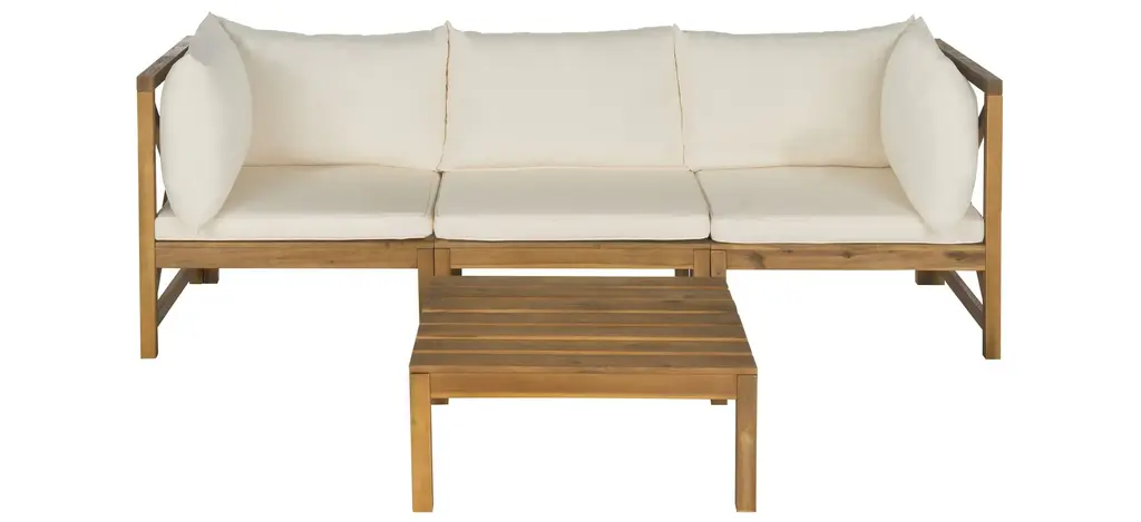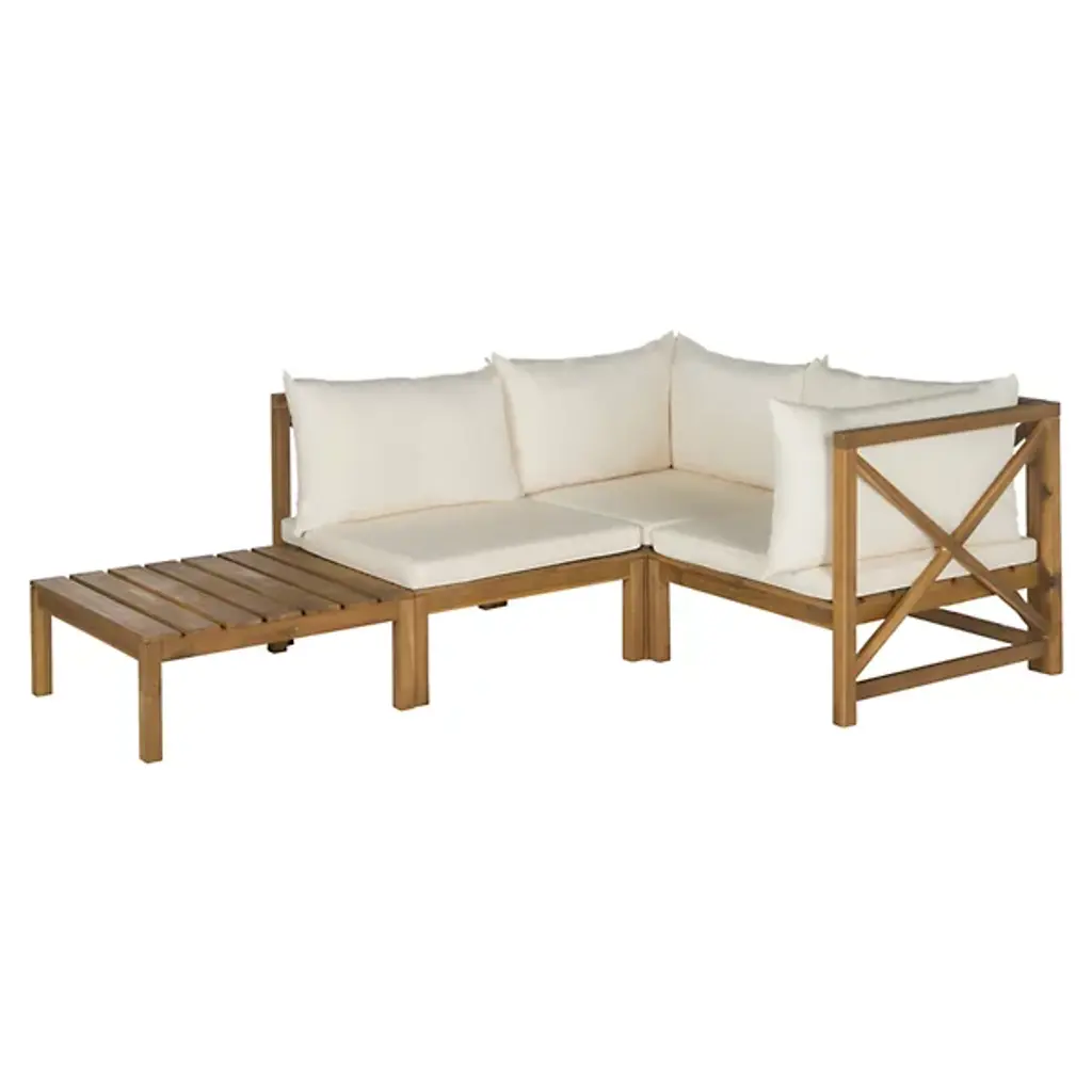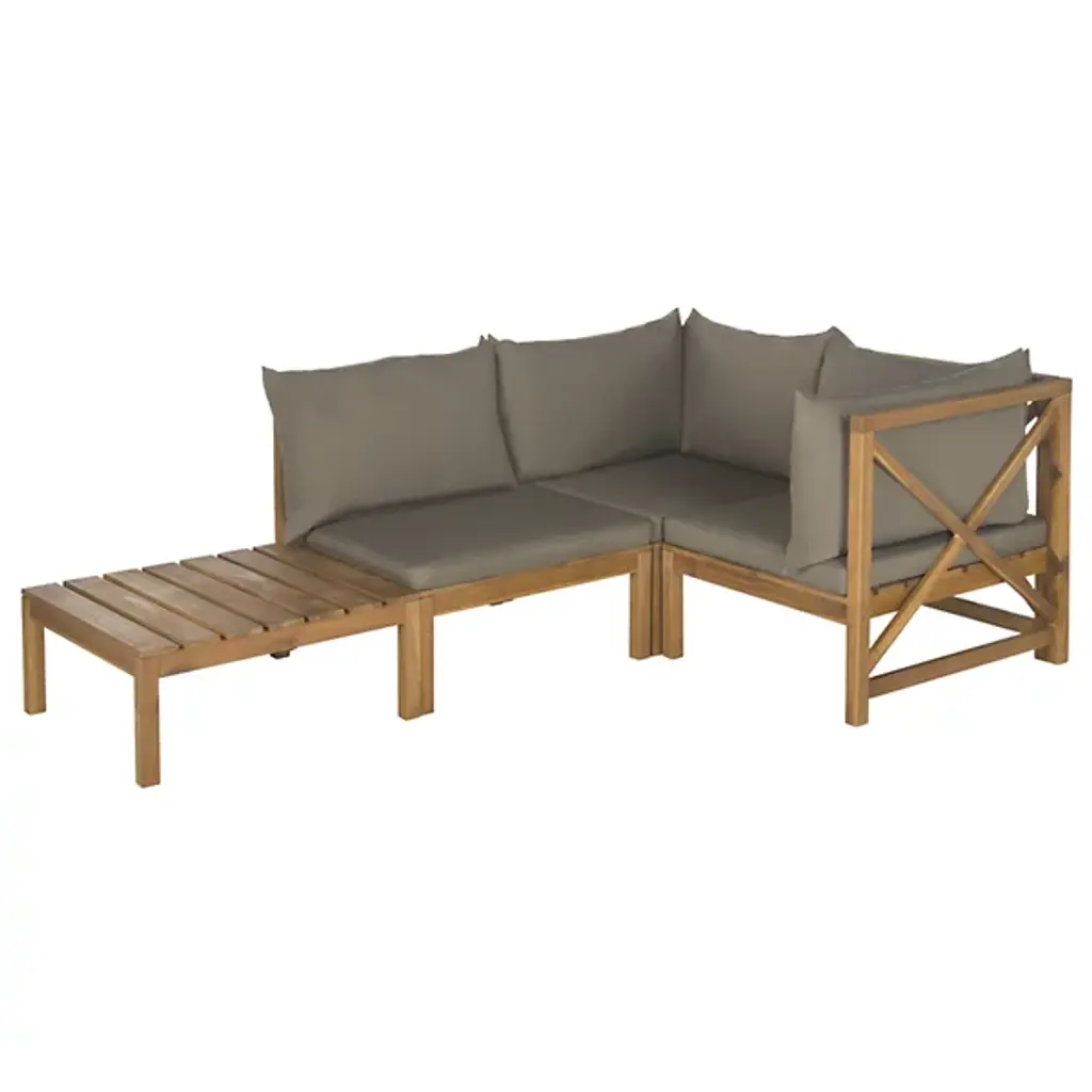 The Funston Modular Outdoor Sectional from Alder & Ore adapts to your outdoor living needs with smart flexibility. Its modular design includes two corner pieces, an armless seat, and a multi-purpose coffee table that doubles as an end table. The acacia wood frame supports plush polyester cushions filled with high-grade foam, offering supreme comfort for outdoor relaxation. The galvanized steel accents add structural integrity while complementing the natural wood tones.