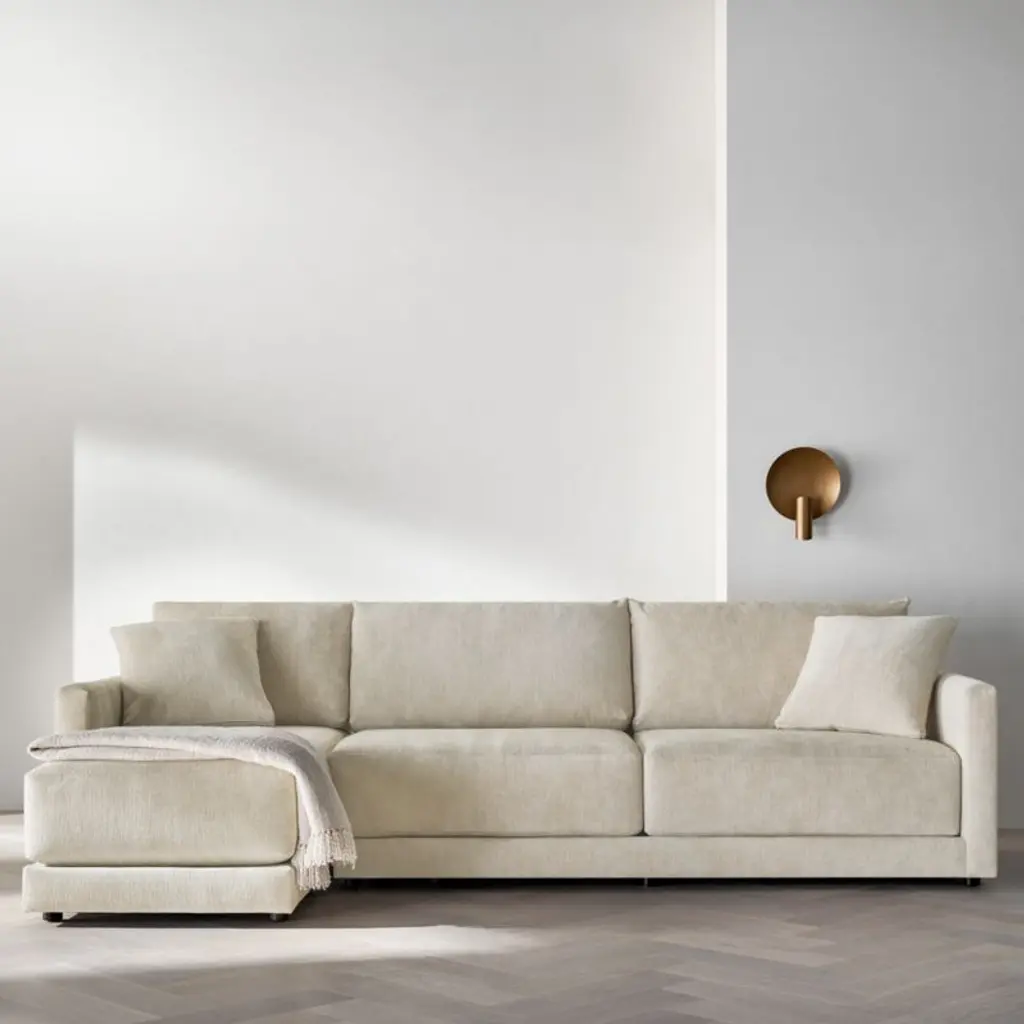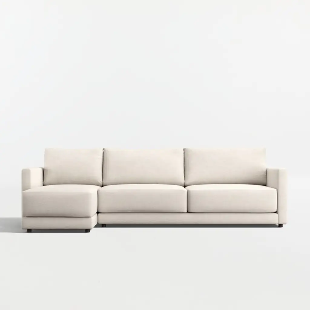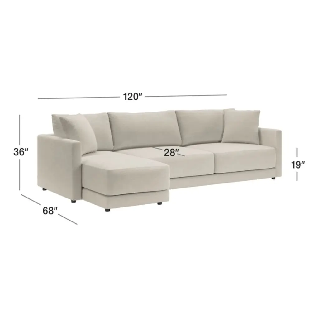Striking the perfect balance between maximum comfort and modern style, our Gather sectional sofa is clean-lined and current. Deep-seated cushions are boxy and extra-plush made with inner-coil construction for maximum comfort and durability. Fiber-filled back cushions settle you in for the ultimate lounge.