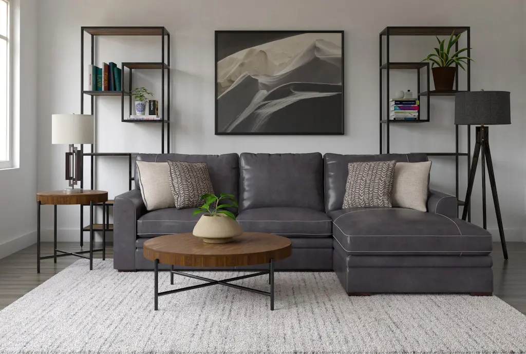 Introducing the Greer Dark Grey Black Leather 2 Piece 105" Modular Sectional with Right Arm Facing Chaise and Left Arm Facing Loveseat. This deep seated sectional offers unparalleled comfort with its soft, foam cushions and is perfect for any living room. The modular design allows for easy configuration to fit your space perfectly.