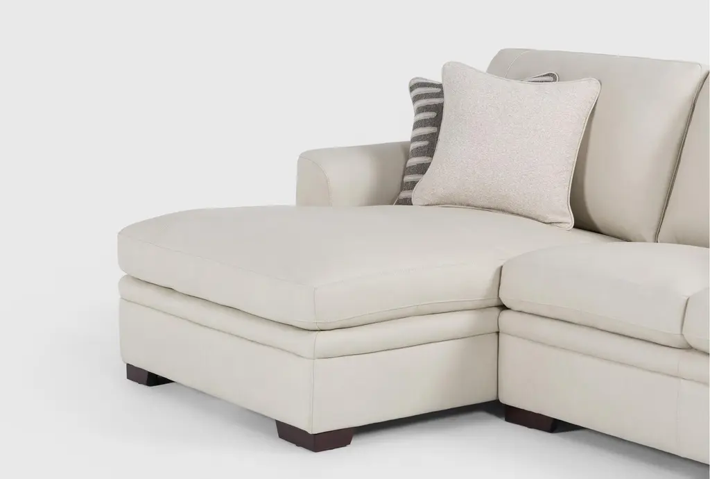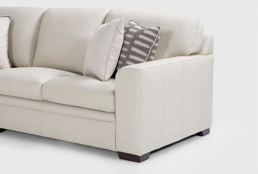 Experience the ultimate comfort and style with the Greer Vanilla White Leather 4 Piece 140" Modular U-Shaped Sectional with Left Arm Facing Chaise & Armless Loveseat. This deep-seated sectional is designed for relaxation and spacious enough for your entire family. Its soft leather upholstery adds a touch of luxury to your living room.