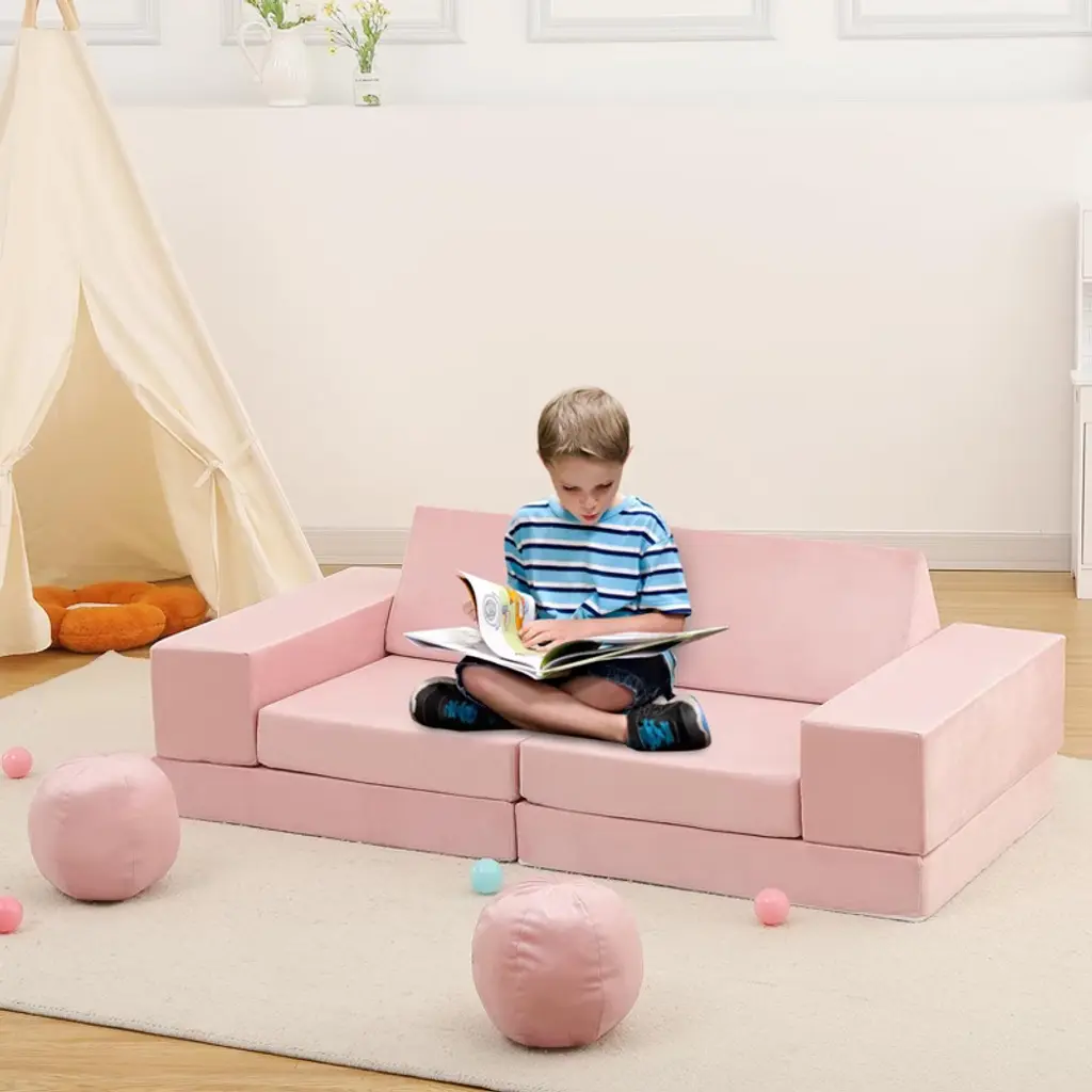 This versatile kids' play couch (27.56''D*55.12''W*17.7''H) features 12 modular pieces including bases, cushions, armrests, and play balls, creating endless configurations for resting, climbing, or imaginative play. Wrapped in plush microvelvet fabric, it offers durable comfort for toddlers and kids, with removable, machine-washable covers for easy maintenance. The high-density foam ensures safety during active play while promoting gross motor skills and creativity. Vacuum-packed for delivery, it expands fully within 24 hours for instant fun—no assembly needed! Perfect for playrooms, bedrooms, or cozy reading nooks, it balances style, safety, and developmental play in one stylish set.