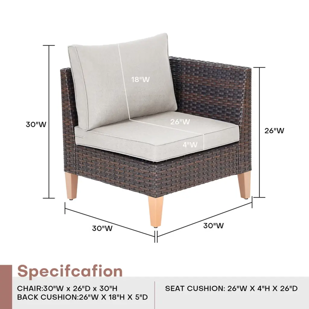 Feature CORNER SEAT MODULE --- Solid, eco-friendly and durable frame, high-density sponge, 100% polyester fabric. Connects seamlessly with Ottoman Module or Middle Module for modular sofa versatility.TAILOR YOUR SEATING --- Versatile and customizable design allows personal layout configurations. Add, rearrange, or separate parts for a customized sofa experience.AESTHETICS FOR EVERY SPACE --- Dressed in soft and durable polyester fabric, our modular sofa effortlessly complements any interior design. Modern elegance in a simple design style. About this item Modular Combination: Our patio 2-piece sofa set opens up unlimited configurations for any occasion. Combining with other outdoor furniture sets provides more seating options and increases your outdoor space. Create a new look and experience for your yard, deck, garden, and other space.Sturdy and Durable: Made of hand-woven premium PE rattan, this outdoor wicker sectional sofa is lightweight and weather-resistant. Constructed from the strong powder-coated durable steel frame, it provides extra support and durability. All of this ensures that the outdoor sofas can be used for several years. The weight capacity of each sofa is 300lbs.Ergonomic Design: Outdoor patio furniture sofa with armrests gives you the best support and brings you an amazing and cozy experience. With upgraded adjustable feet, you can easily adjust the height to maintain balance. The free fasteners can hold the sofas together well and prevent sofas from moving.Upgraded Comfort: Come with wide and deep sofas and 4-inch breathable cushions, the patio wicker conversation set provides maximum comfort and relaxation to enjoy your leisure time completely. The meticulous velcro design can prevent the cushion from sliding. Packing List 1* Sectional Sofa with cushion1* All hardware and manual