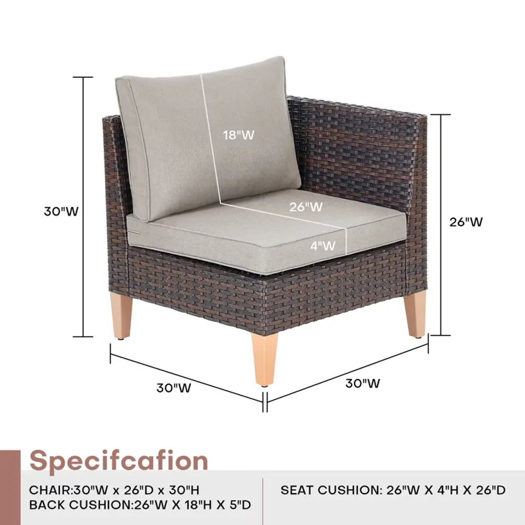 Feature CORNER SEAT MODULE --- Solid, eco-friendly and durable frame, high-density sponge, 100% polyester fabric. Connects seamlessly with Ottoman Module or Middle Module for modular sofa versatility.TAILOR YOUR SEATING --- Versatile and customizable design allows personal layout configurations. Add, rearrange, or separate parts for a customized sofa experience.AESTHETICS FOR EVERY SPACE --- Dressed in soft and durable polyester fabric, our modular sofa effortlessly complements any interior design. Modern elegance in a simple design style. About this item Modular Combination: Our patio 2-piece sofa set opens up unlimited configurations for any occasion. Combining with other outdoor furniture sets provides more seating options and increases your outdoor space. Create a new look and experience for your yard, deck, garden, and other space.Sturdy and Durable: Made of hand-woven premium PE rattan, this outdoor wicker sectional sofa is lightweight and weather-resistant. Constructed from the strong powder-coated durable steel frame, it provides extra support and durability. All of this ensures that the outdoor sofas can be used for several years. The weight capacity of each sofa is 300lbs.Ergonomic Design: Outdoor patio furniture sofa with armrests gives you the best support and brings you an amazing and cozy experience. With upgraded adjustable feet, you can easily adjust the height to maintain balance. The free fasteners can hold the sofas together well and prevent sofas from moving.Upgraded Comfort: Come with wide and deep sofas and 4-inch breathable cushions, the patio wicker conversation set provides maximum comfort and relaxation to enjoy your leisure time completely. The meticulous velcro design can prevent the cushion from sliding. Packing List 1* Sectional Sofa with cushion1* All hardware and manual
