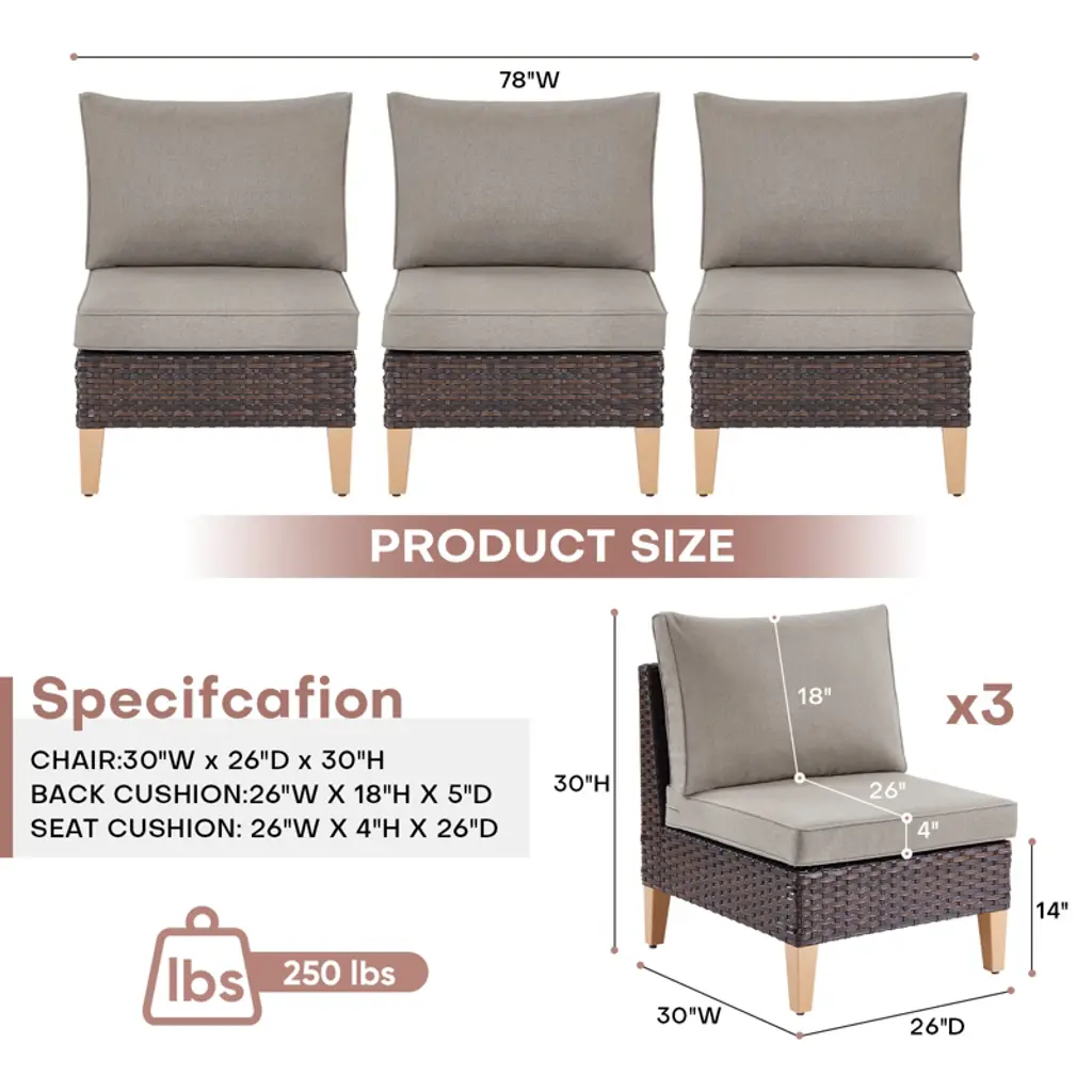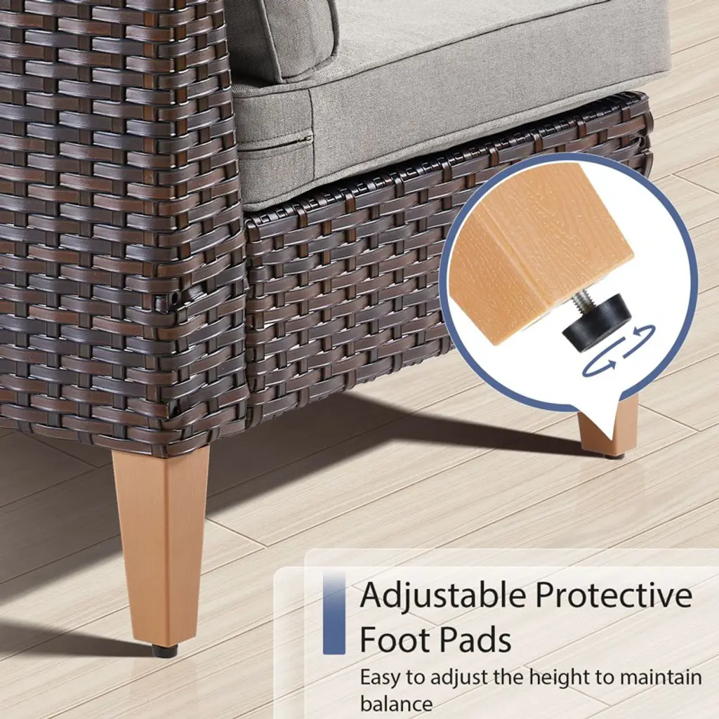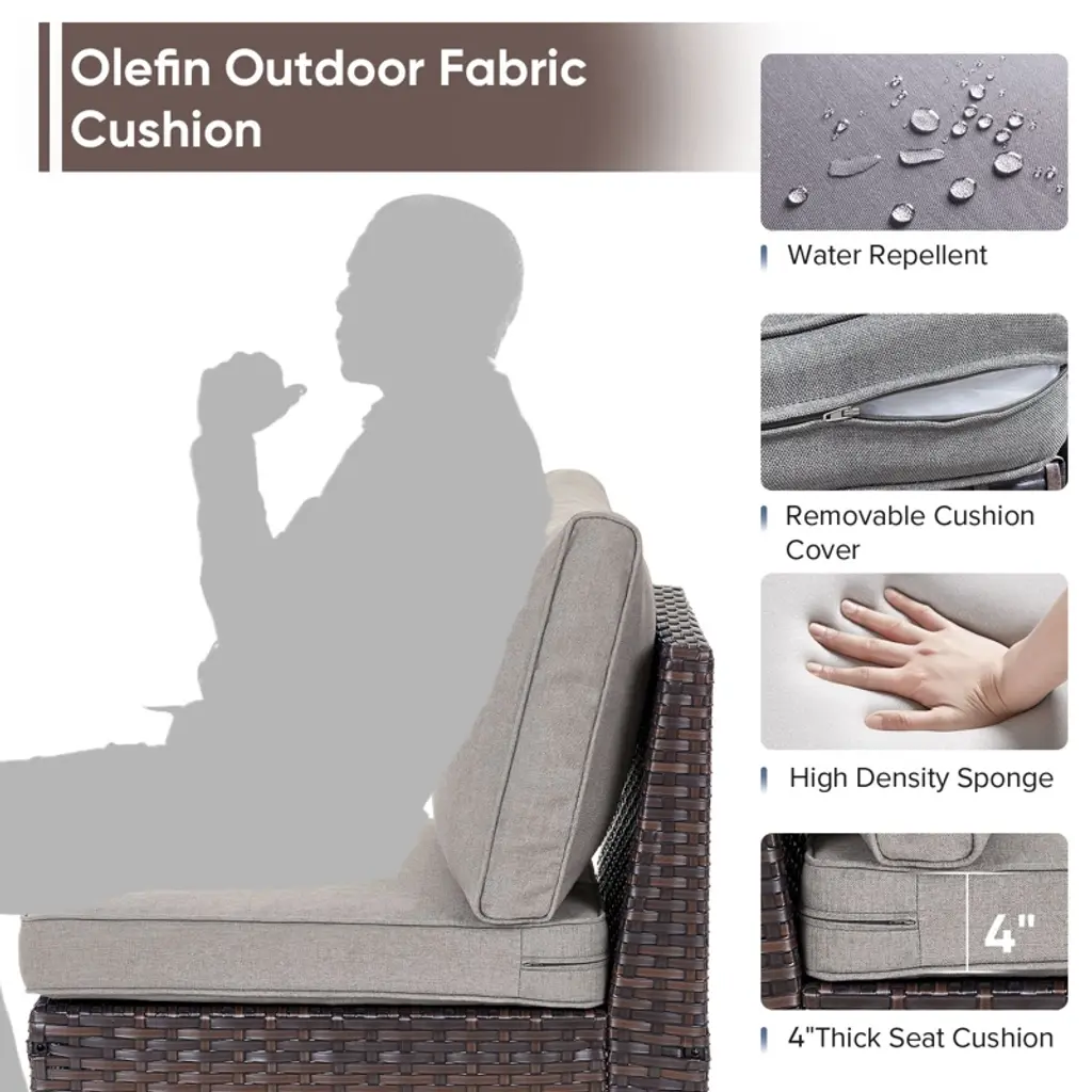 Feature Rattan Color: Brown RattanCushion Color: Blue; Beige; GreyFabric Type: PE WickerBase Material: Rattan + SteelFrame Material: PE WickerSeat Height: 4 InchesAssembly Required: Yes Light Up Your Patio Space! The Outdoor patio furniture is perfect for various scenarios. Thickened cushions(4") with anti-slip plastic fabric bring you extraordinary comfort and relaxation, anti-slip and practicality are far better than lacing or velcro. Steel frame, all-weather rattan, and water-resistance cushion cover; highlights, furniture cover make this outdoor couch sectional super durable. Various styles, fashionable and atmospheric design, suitable for family gatherings or business conversation. Natural, beautiful, multi-color options, a wide range of application scenarios. All-weather outdoor patio furniture, with furniture cover, easy to maintain and manage. About this item WATER RESISTANT CUSHIONS: The outdoor-rated cushion covers are PU-coated polyester fabric that is UV-ray, stain, and moisture-resistant and is softer than standard polyester. The 4'' cushions of this outdoor conversation set, providing excellent support and reduces fatigue, allowing you to relax and immerse yourself in comfort for extended periods of time. In addition, the removable cushions with smooth zipper make cleaning a breeze.ALL-WEATHER MATERIALS: This wicker patio furniture set features all-weather resin open basketwave patterned wicker that is rated at 1000 UV hours, is easy to clean, and extremely resistant to the sun, rain, heat, and cold to not crack, sag, or fade. The wicker is hand-woven over powder-coated steel frames to withstand the outdoor elements, providing superior durability and toughness. Also the wicker has been roughened to make it more realistic and close to nature.MODERN & ELEGANT: The combination of minimalist lines and tapered metal legs makes outdoor modular sofa modern and elegant. Its open basketweave patterned wicker is timeless and stylish, adding structure and comfort to your garden, backyard, porch, deck, or patio.EASY ASSEMBLY & WARRANTY: All necessary tools, hardware, and the instruction manual are included. Easily assembled by one person. What's in the box? 2* Modular Sofa with cushion (Handrail not included)1* Assembly required with all necessary hardware and clear instructions included.