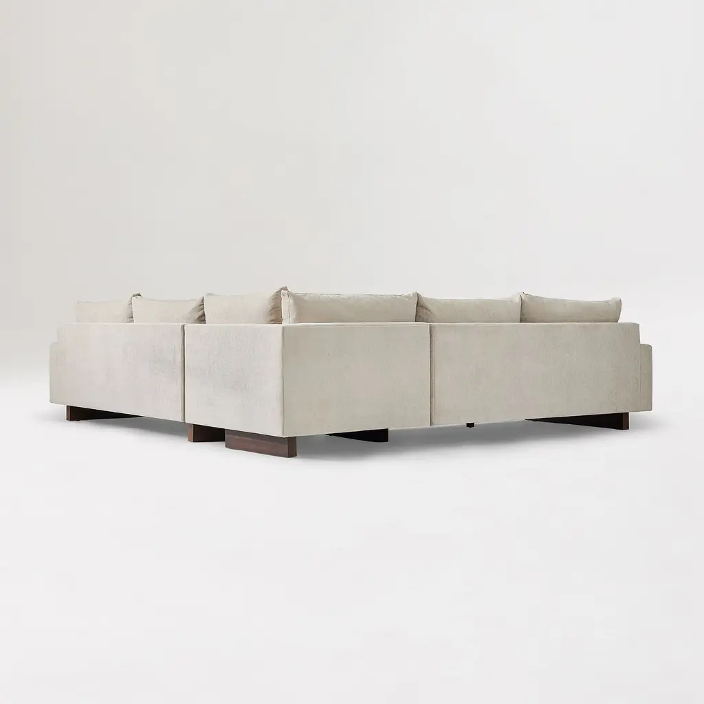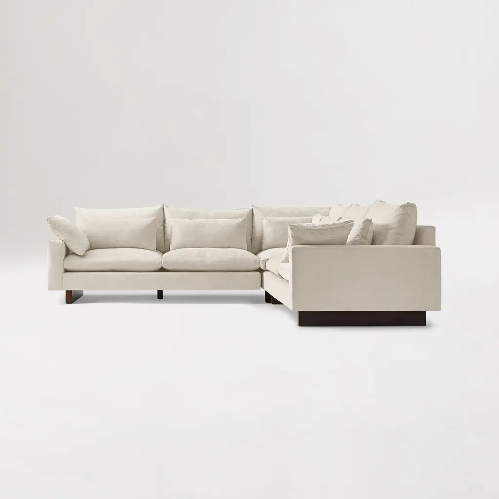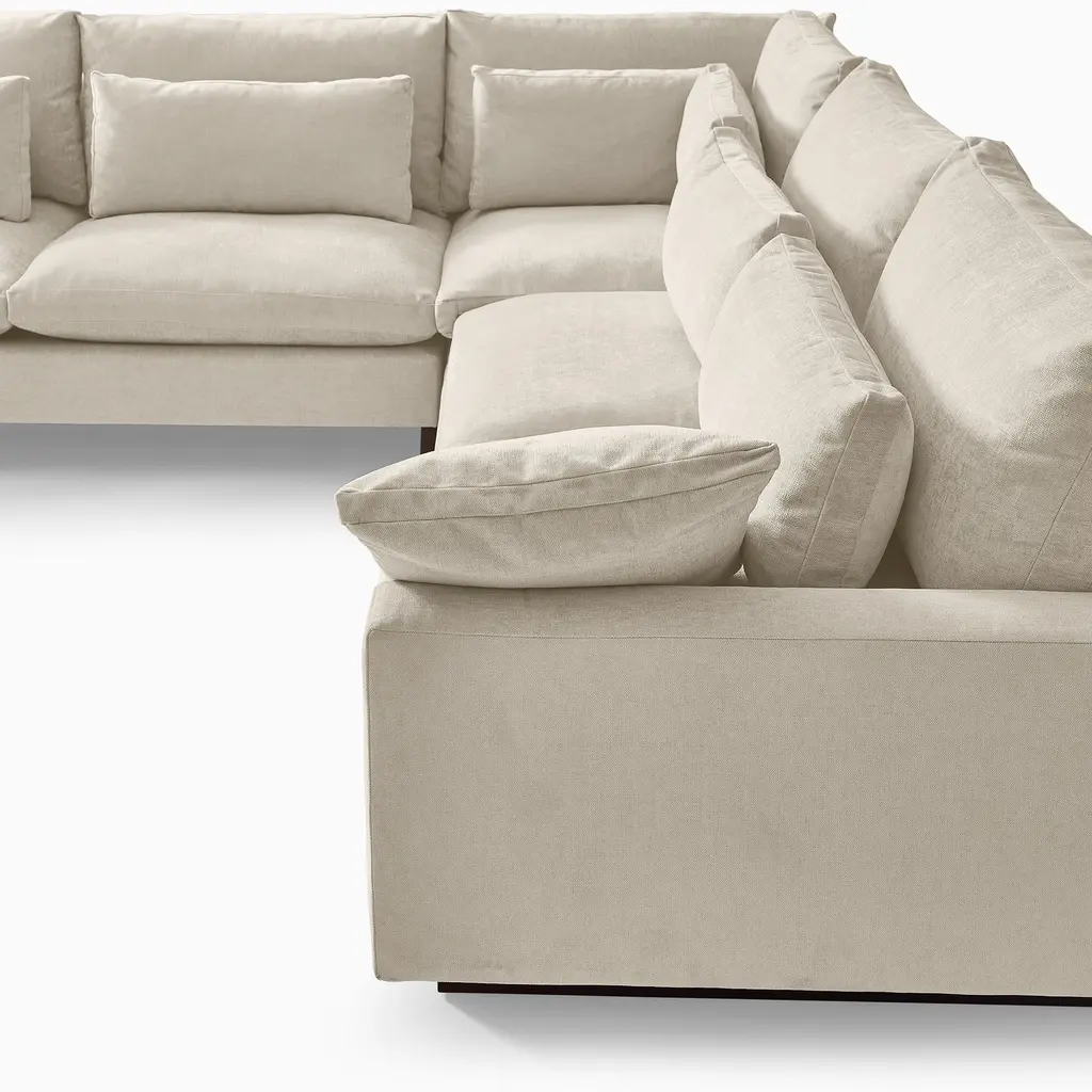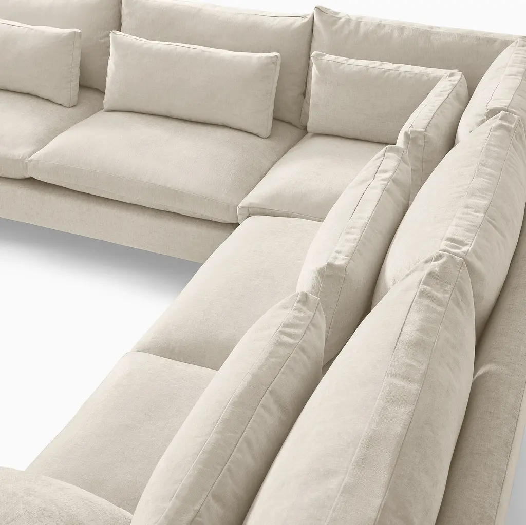 This modern sectional is all about comfort. Pillowy-soft cushions top the spacious body. Kiln-dried, clean-lined frame has reinforced joinery. Hand-built frames with hand-finished upholstery.