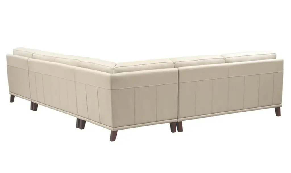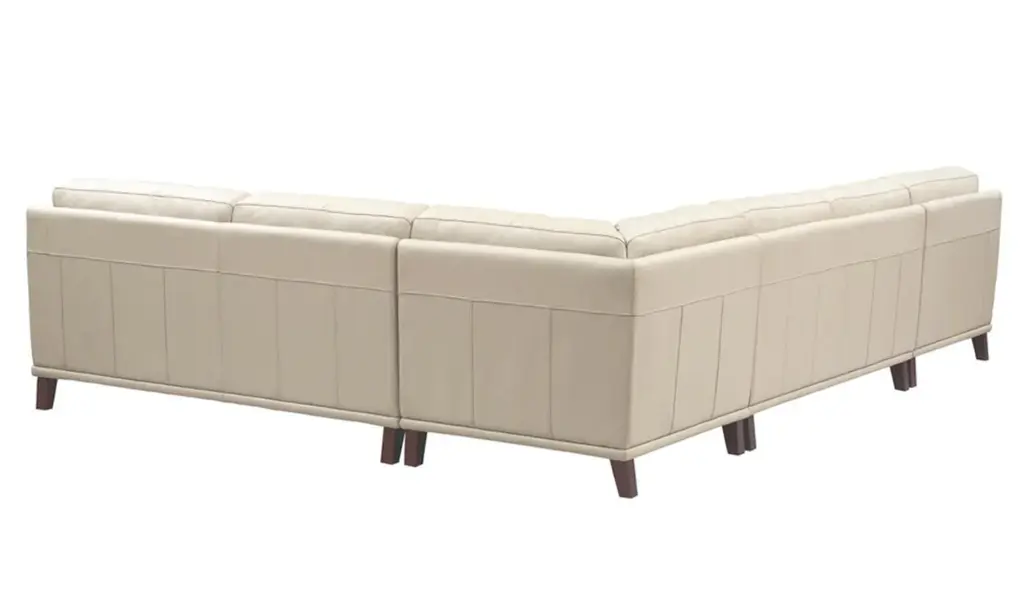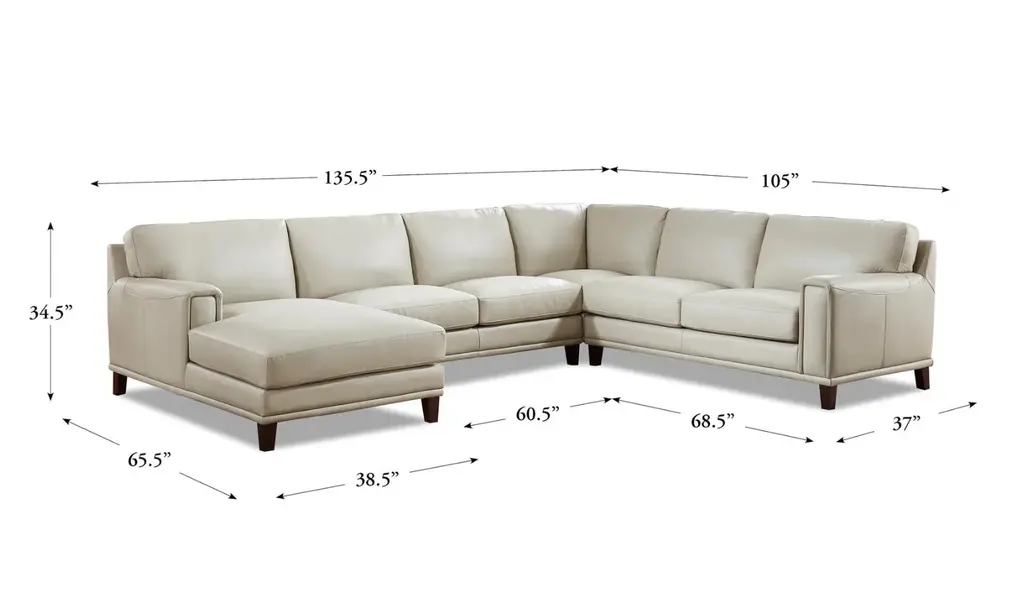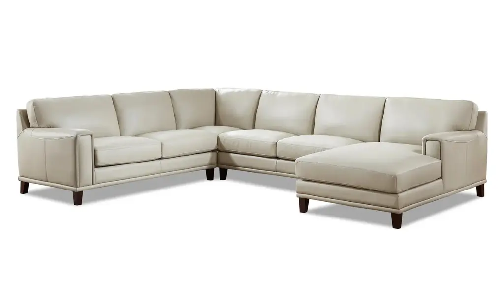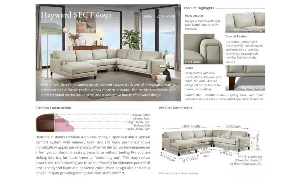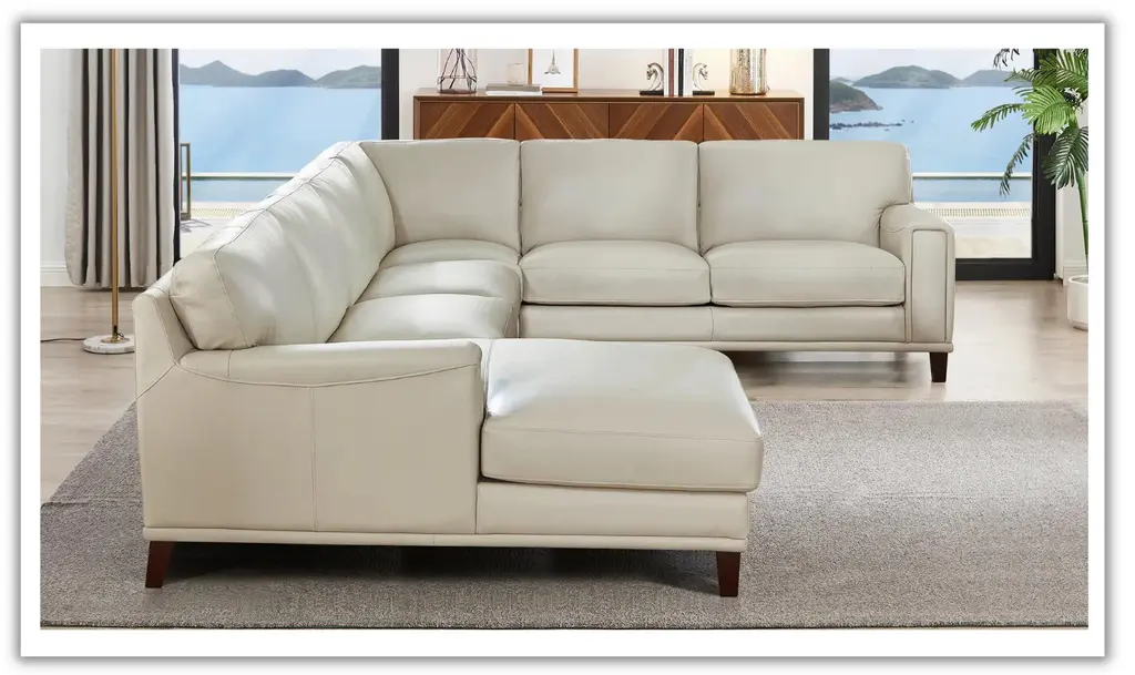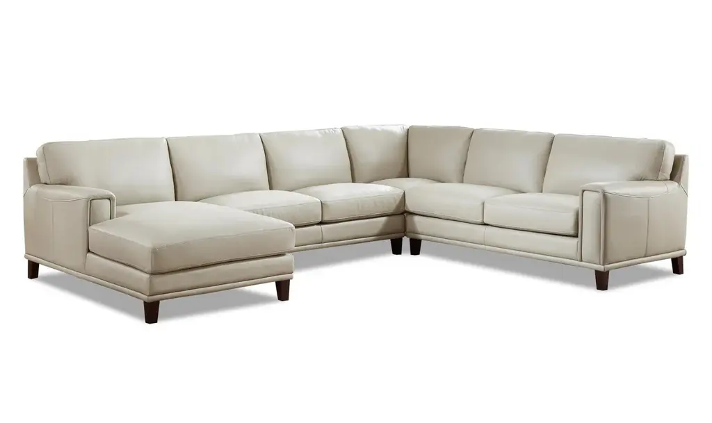 The Hayward 5-Piece Leather Sectional Sofa in Vanilla White seamlessly blends timeless elegance with contemporary style. Defined by its clean lines and distinct square track arms, the Hayward Collection offers a sophisticated yet modern profile. The padded silhouette and curved accent stitching on the inside arms add a unique touch, elevating the overall design. Crafted from premium materials, the Hayward sectional features top-grain leather on the seating areas and armrests, complemented by split-grain leather on the sides and back. This combination ensures durability and a luxurious feel. The seating experience is enhanced by a unique blend of premium goose feathers, down, pocketed coils, memory foam, and high-resiliency foam, providing ultimate comfort. Non-removable back cushions maintain a sleek appearance, while removable seat cushions, with convenient zip covers, make cleaning and maintenance effortless. Built to last, the sectional boasts a kiln-dried solid wood frame, reinforced with L-braced and glued corner blocks. The no-sag spring base and foam-padded sides and back offer additional support and comfort. The Hayward 4-Piece Leather Sectional Sofa in Vanilla White is the perfect addition to any living space, combining classic and contemporary elements in a stylish, durable design.