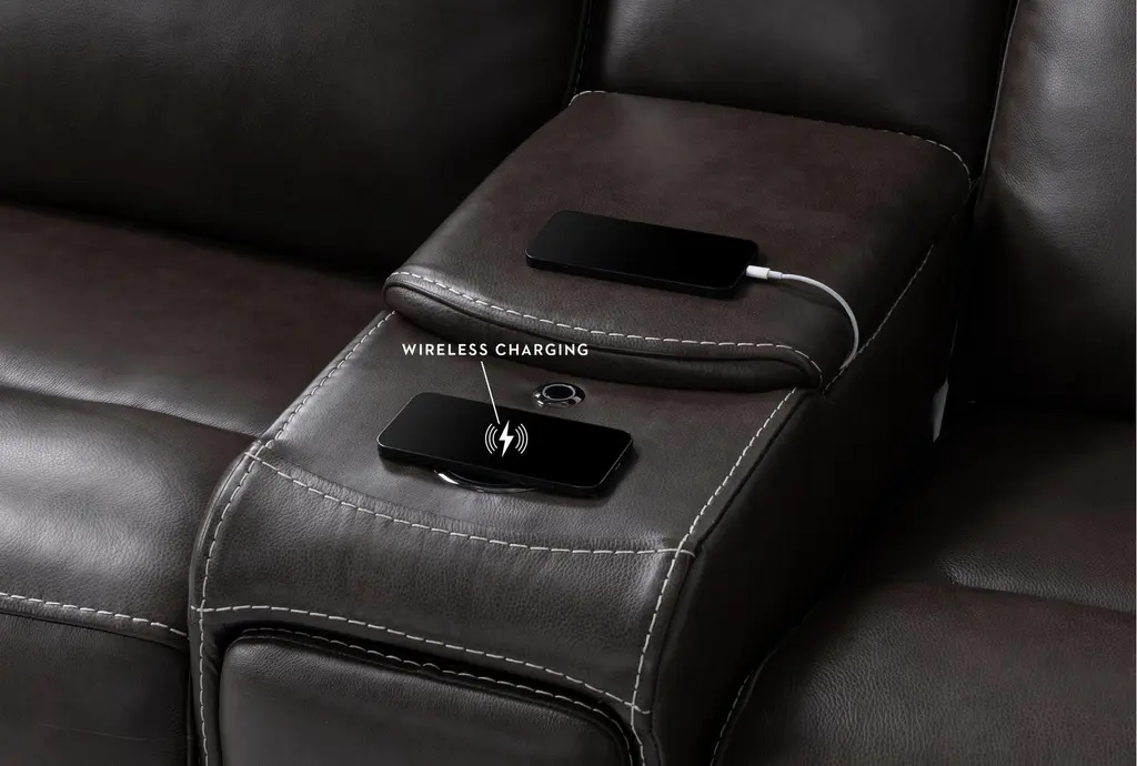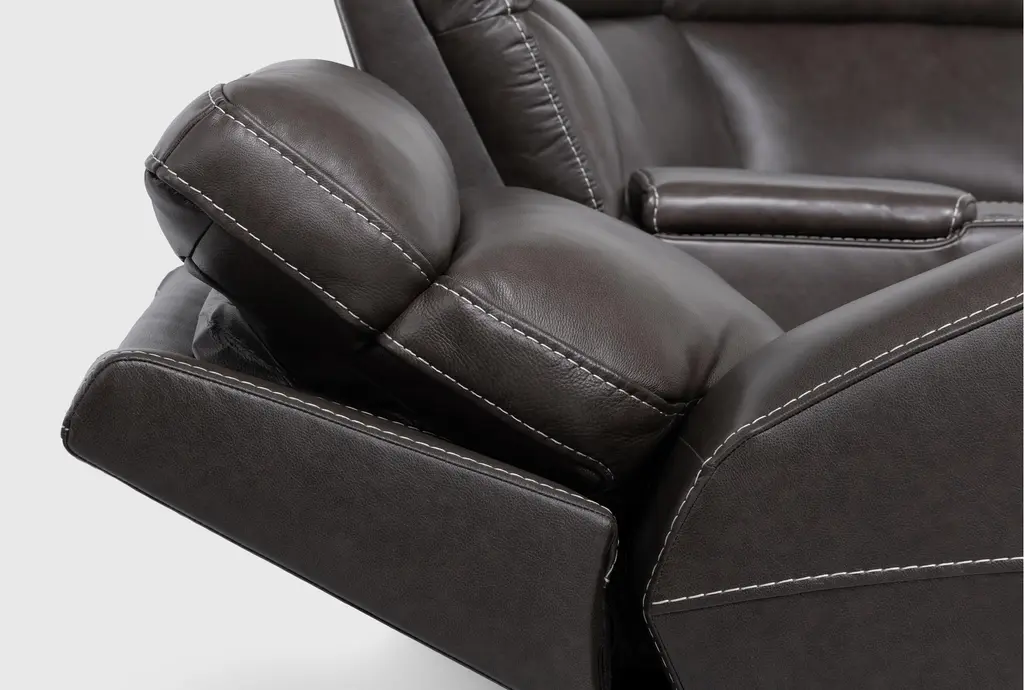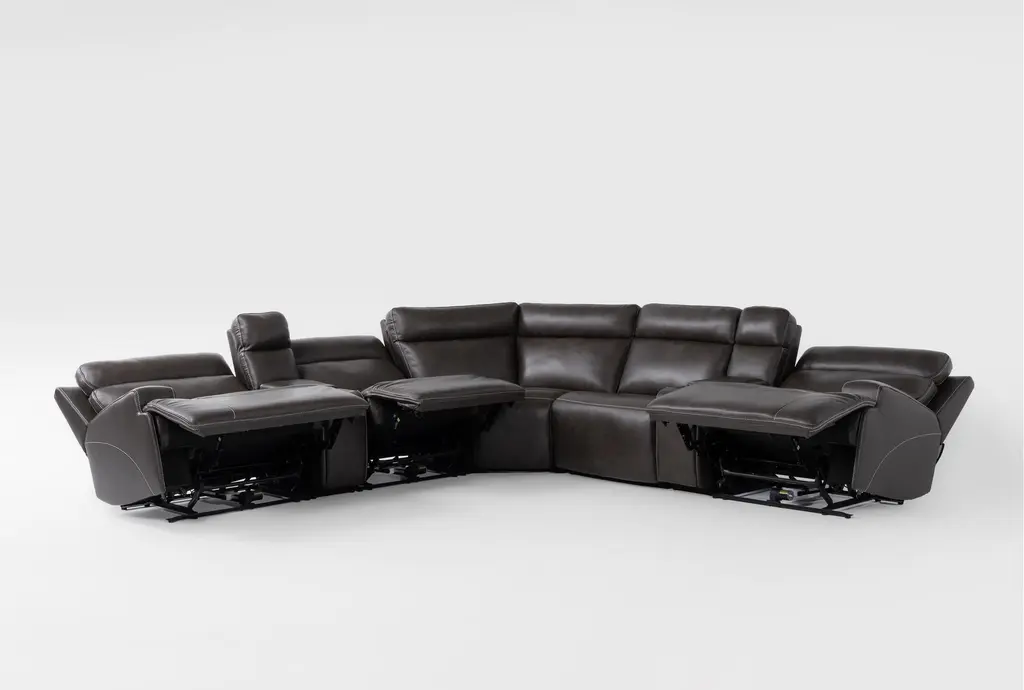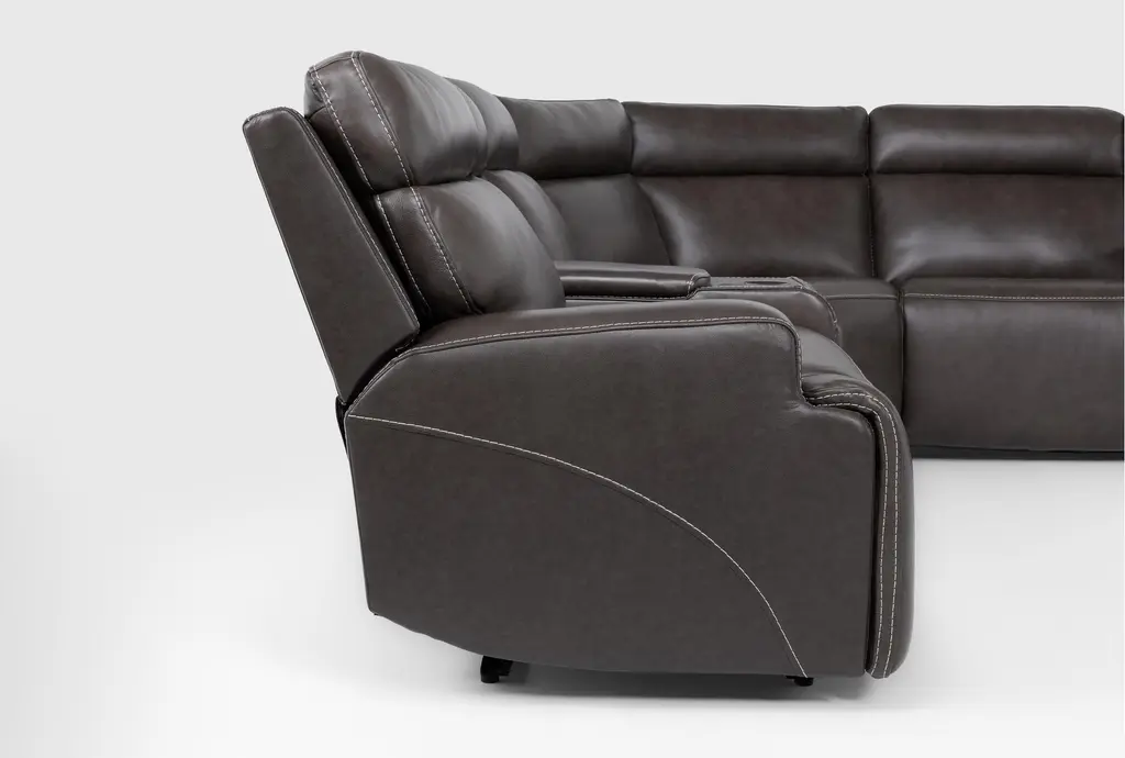 Experience the ultimate in relaxation and convenience with the Hugo Brown Leather 127" 7 Piece Reclining Sectional. Designed for casual living, this sectional provides ample seating and premium comfort. Crafted from 100% top grain leather, it features two consoles with power headrest, power lumbar, and USB functionality, making it perfect for your living room.