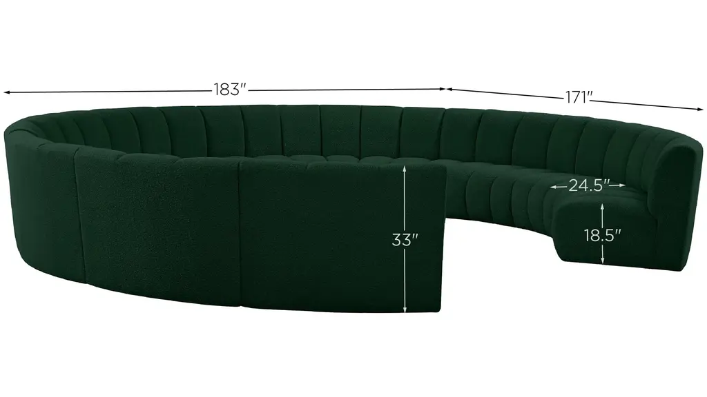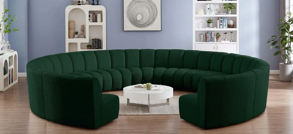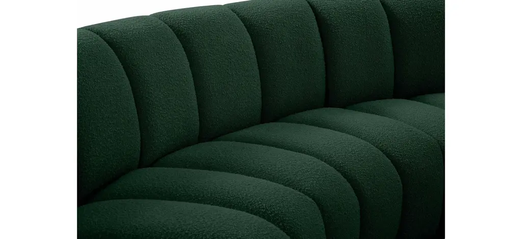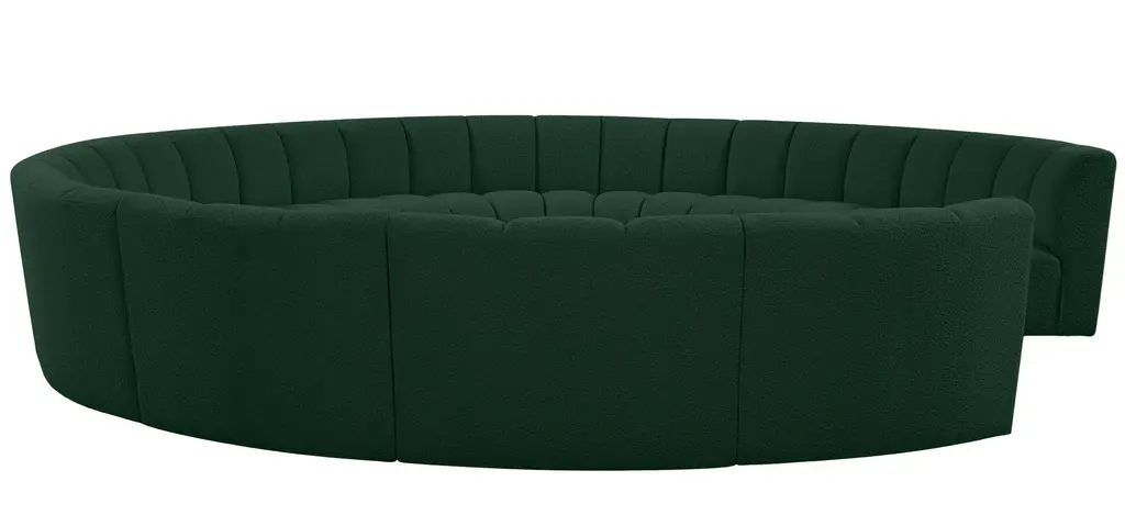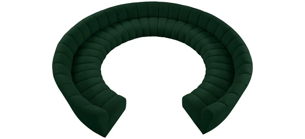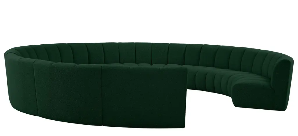 The Infinity 11-pc.. Modular Sectional is the best possible seating solution for your gang. Rich green boucle fabric feels welcoming and soft to the skin, so you stay seated comfortably for the big game or while watching your favorite programs. Deep channel tufting adds to the longevity and durability of this modular chair while giving it texture.