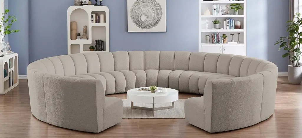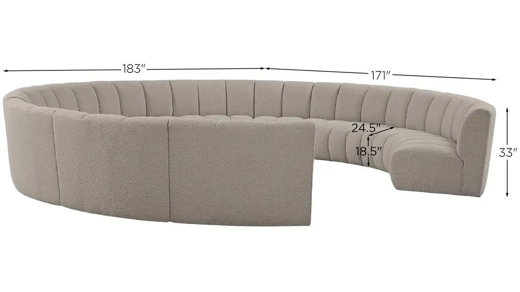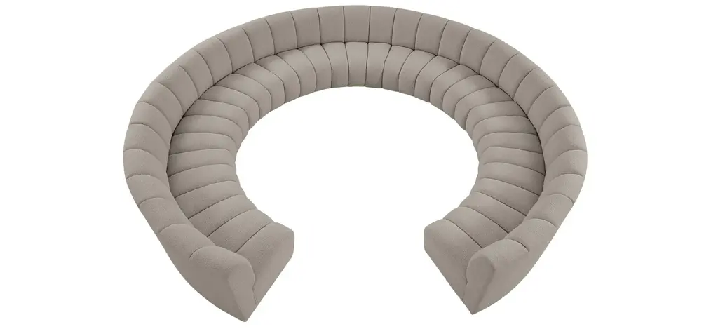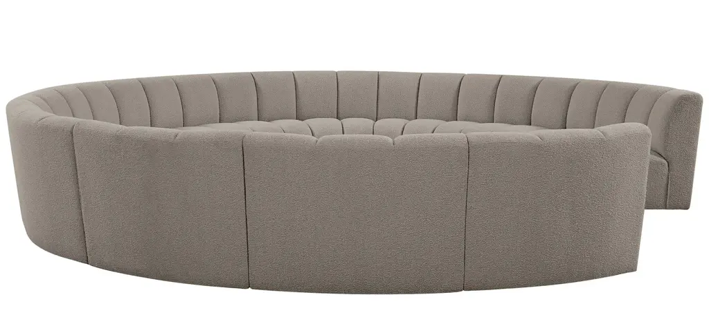 The Infinity 11-pc.. Modular Sectional is the best possible seating solution for your gang. Rich brown boucle fabric feels welcoming and soft to the skin, so you stay seated comfortably for the big game or while watching your favorite programs. Deep channel tufting adds to the longevity and durability of this modular chair while giving it texture.