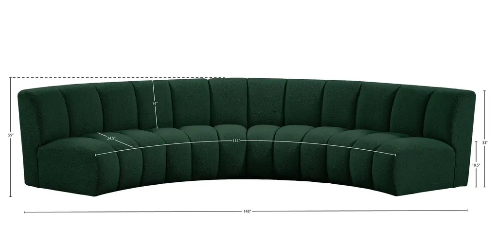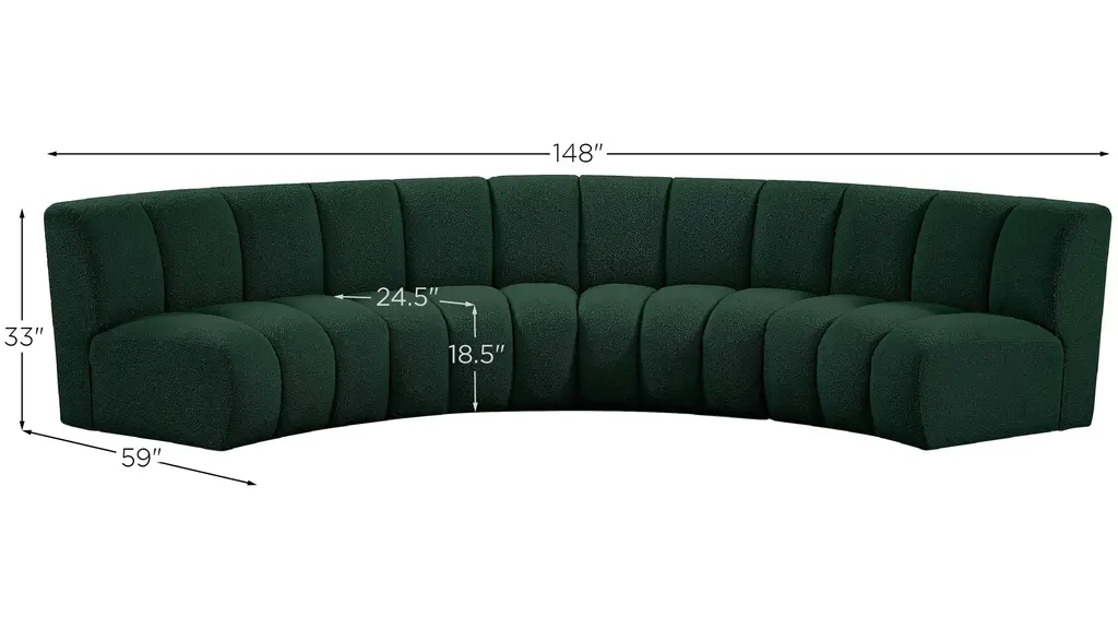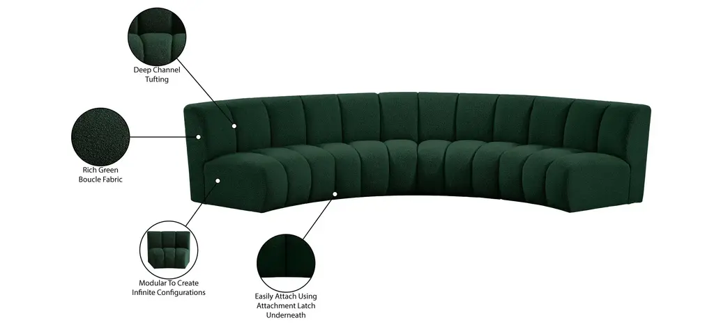 The Infinity 4-pc. Modular Sectional is the best possible seating solution for your gang. Rich green boucle fabric feels welcoming and soft to the skin, so you stay seated comfortably for the big game or while watching your favorite programs. Deep channel tufting adds to the longevity and durability of this modular chair while giving it texture.