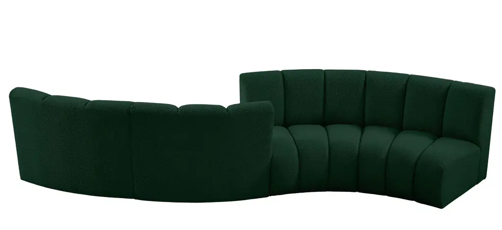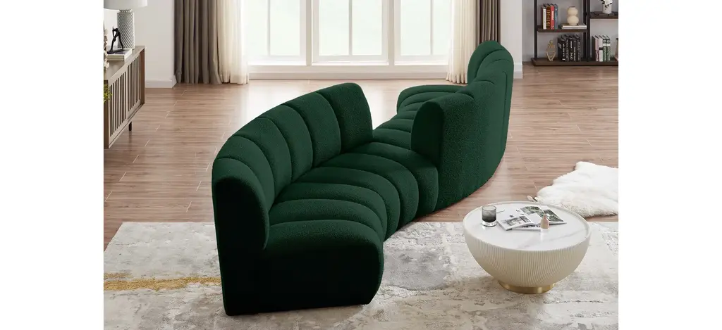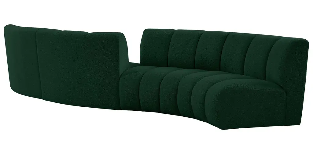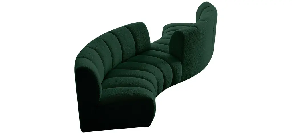 The Infinity 4-pc. Modular Sectional is the best possible seating solution for your gang. Rich green boucle fabric feels welcoming and soft to the skin, so you stay seated comfortably for the big game or while watching your favorite programs. Deep channel tufting adds to the longevity and durability of this modular chair while giving it texture.
