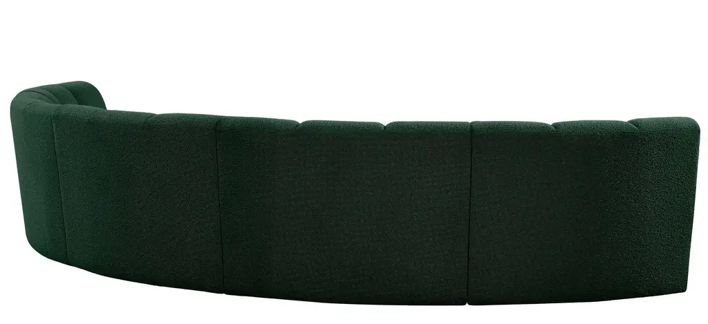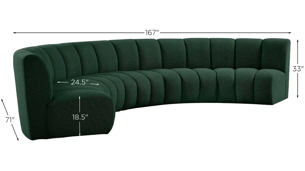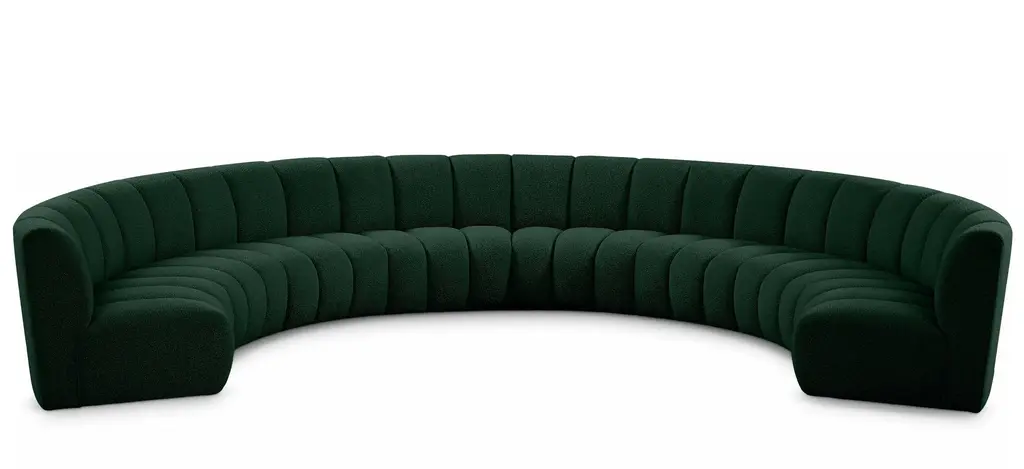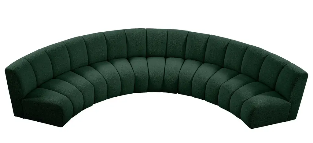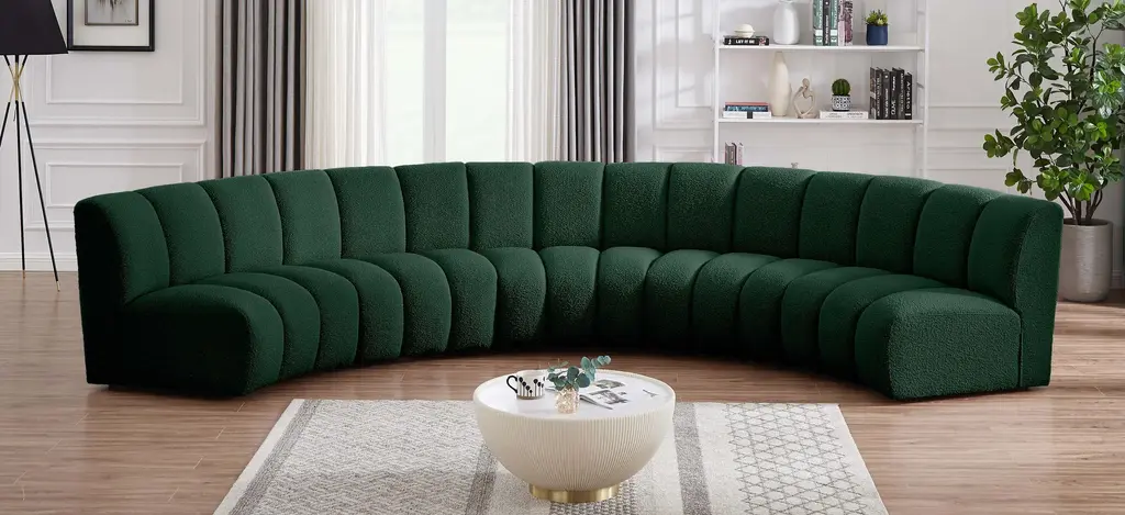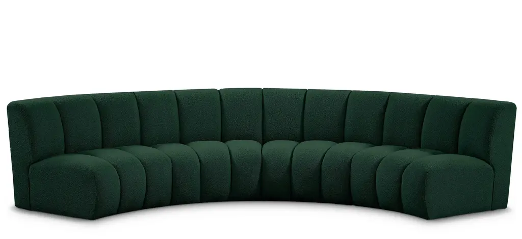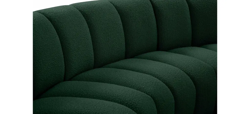 The Infinity 5-pc. Modular Sectional is the best possible seating solution for your gang. Rich green boucle fabric feels welcoming and soft to the skin, so you stay seated comfortably for the big game or while watching your favorite programs. Deep channel tufting adds to the longevity and durability of this modular chair while giving it texture.