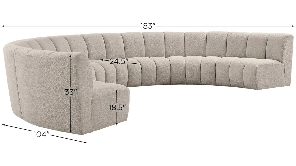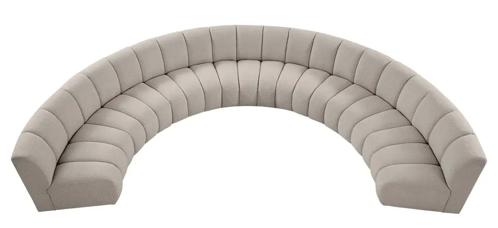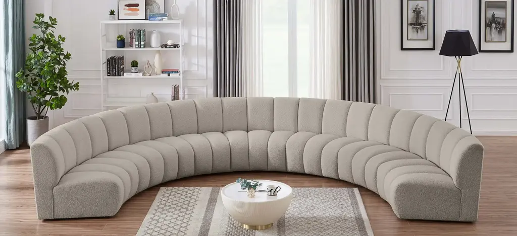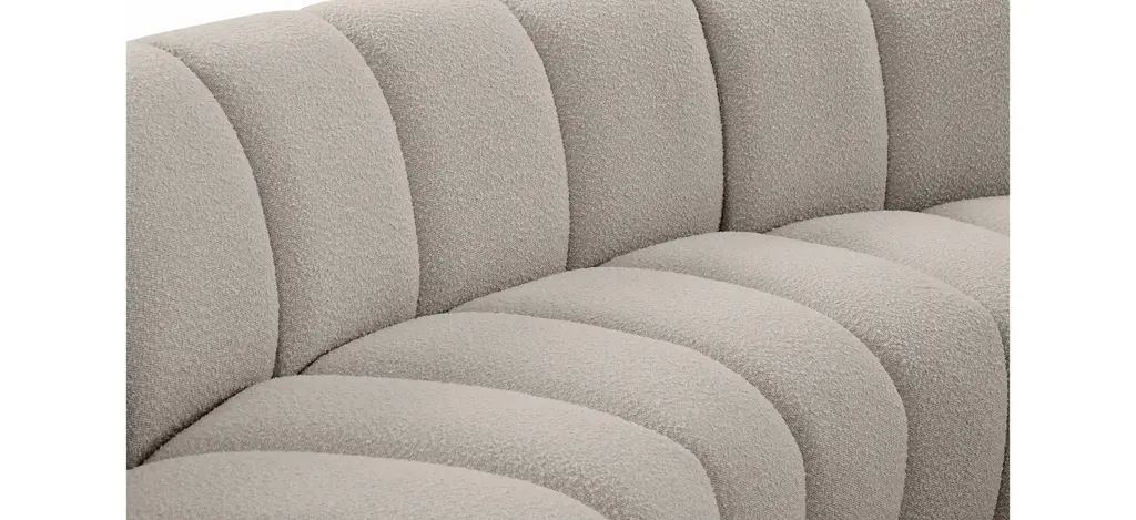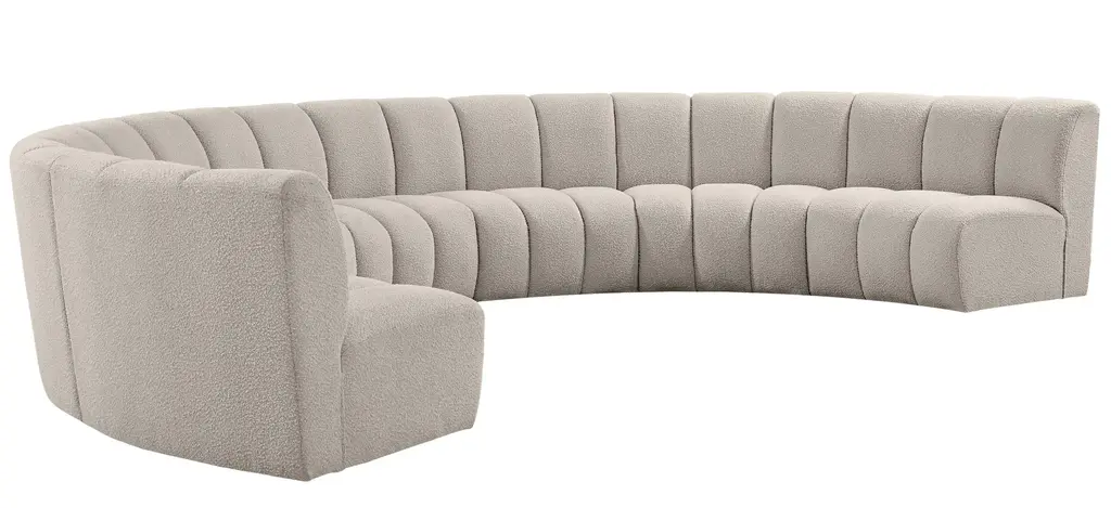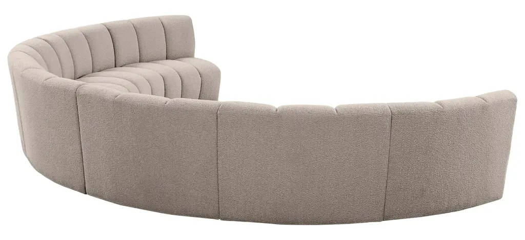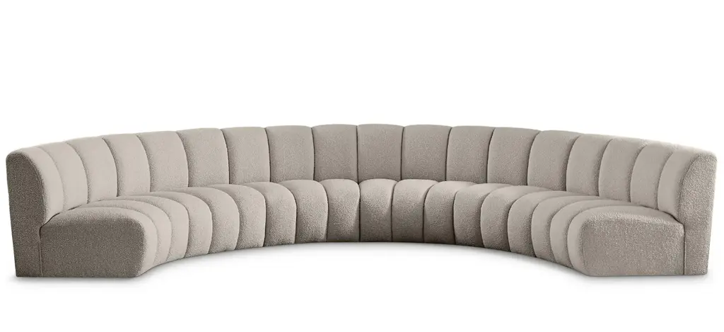 The Infinity 7-pc. Modular Sectional is the best possible seating solution for your gang. Rich brown boucle fabric feels welcoming and soft to the skin, so you stay seated comfortably for the big game or while watching your favorite programs. Deep channel tufting adds to the longevity and durability of this modular chair while giving it texture.