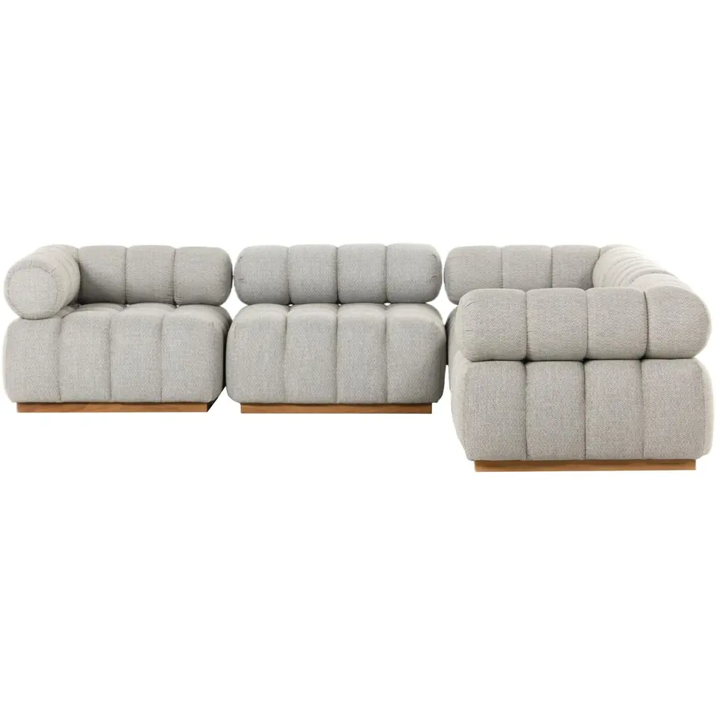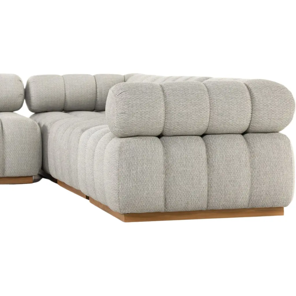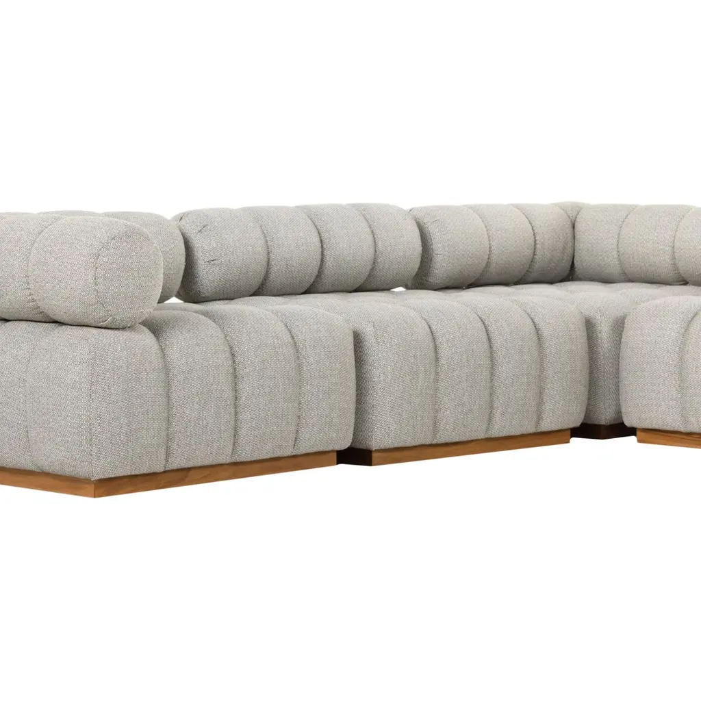 Experience a modern take on mid-century Italian design with the Jessie Outdoor 5-Piece Sectional. This piece combines soft volume and exaggerated proportions for a sculpted look and playful feel. It rests atop a plinth-style teak base, offering dramatic tufting for a comfortable sit, whether indoors or out. Crafted sustainably with zero waste, the luxurious Italian upholstery provides a unique spin on indoor/outdoor seating. The fabric is soft yet durable, highly resistant to sun, stains, mold, and abrasion, ensuring longevity and style. Perfect for any setting, this sectional is a testament to elegance and functionality.