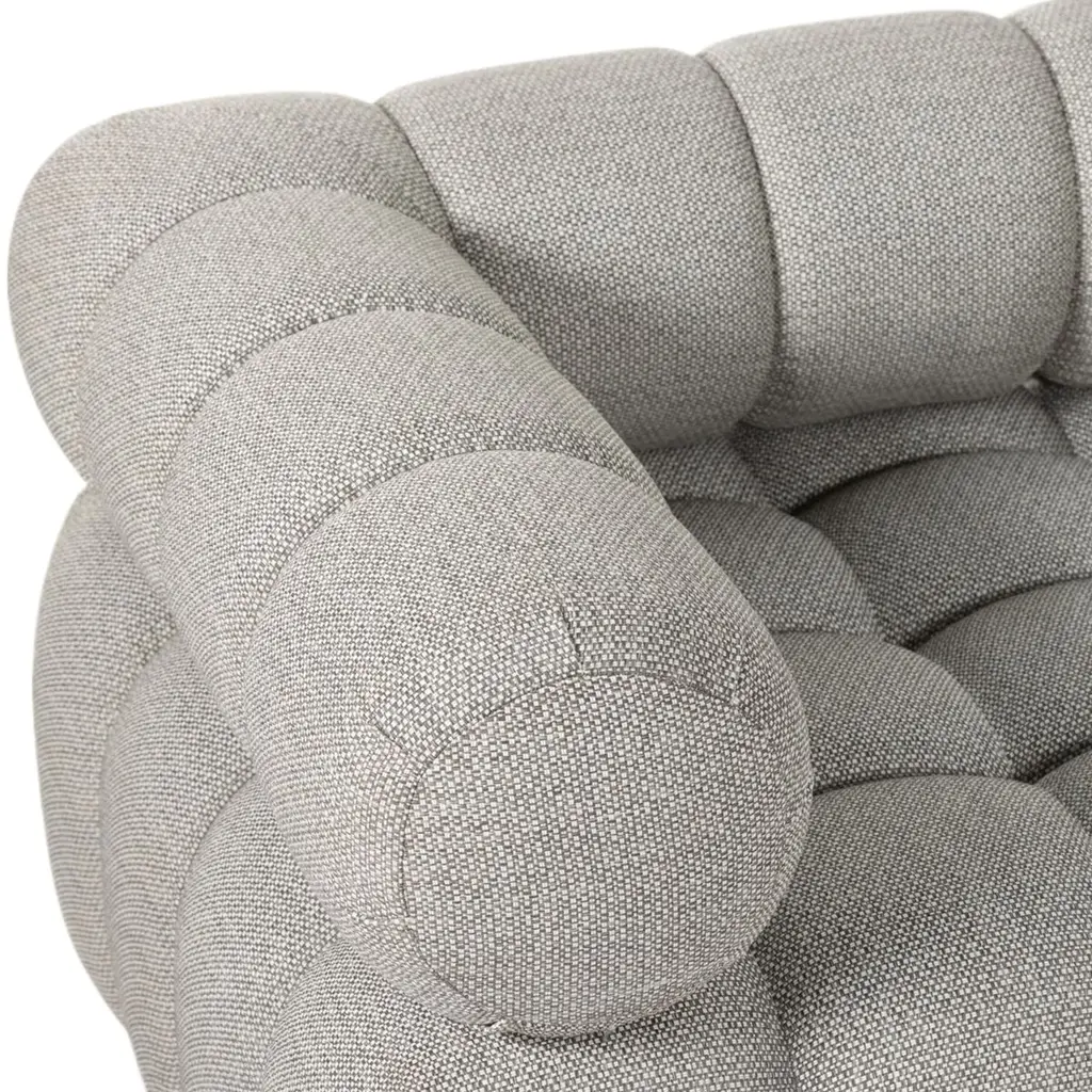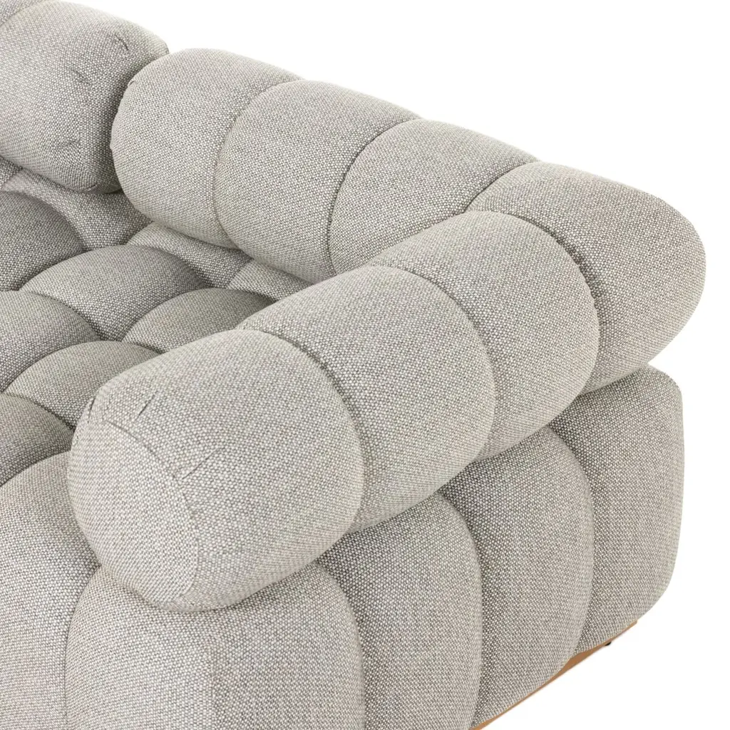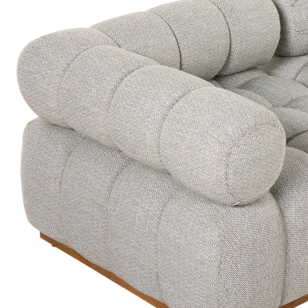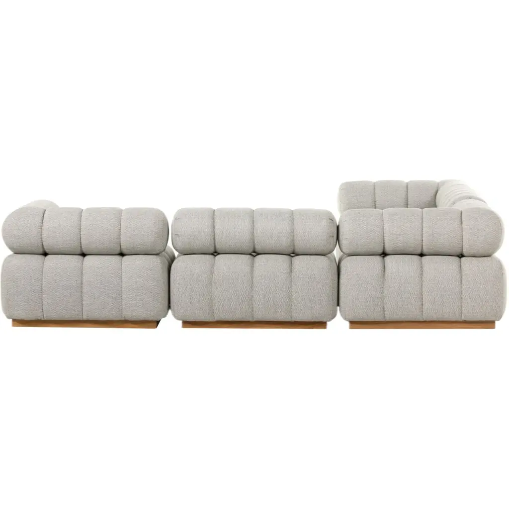 Experience a modern take on mid-century Italian design with the Jessie Outdoor 5-Piece Sectional. This piece combines soft volume and exaggerated proportions for a sculpted look and playful feel. It rests atop a plinth-style teak base, offering dramatic tufting for a comfortable sit, whether indoors or out. Crafted sustainably with zero waste, the luxurious Italian upholstery provides a unique spin on indoor/outdoor seating. The fabric is soft yet durable, highly resistant to sun, stains, mold, and abrasion, ensuring longevity and style. Perfect for any setting, this sectional is a testament to elegance and functionality.