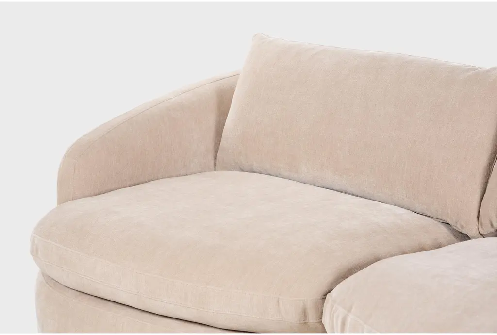 Introducing the Kendall 138" Sand Beige Cloud-Like 5 Piece Curved L-Shaped Modular Sectional & Swivel Cuddler, designed for modern living rooms. This sectional features a reversible orientation, allowing you to customize the setup to fit your space perfectly. Upholstered in a soft Capri wicker fabric, it promises comfort and style.
