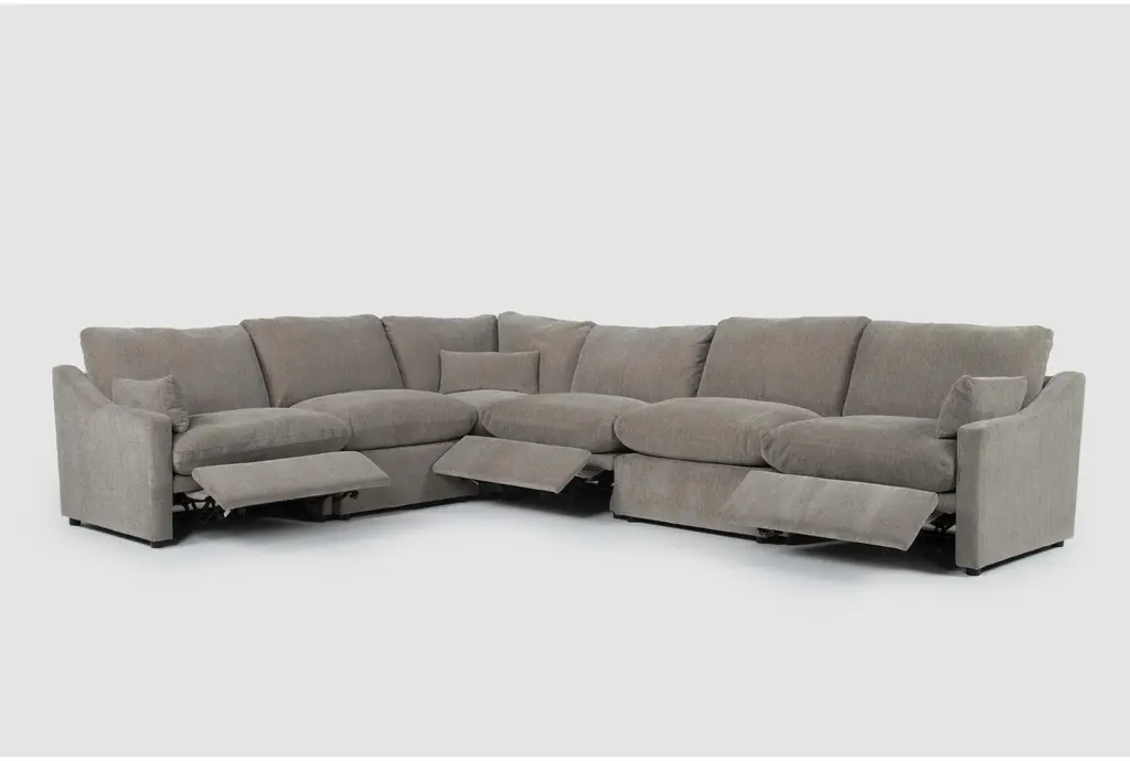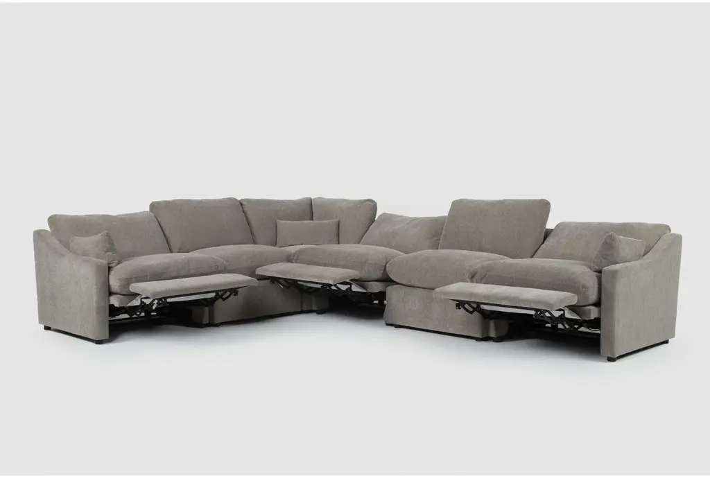 Experience the ultimate in comfort and style with the Kennedy Mocha 6 Piece Power Reclining Modular Sectional. This modern sectional features a versatile, reversible design that fits perfectly in any living room. The rich brown fabric upholstery and sleek lines create a contemporary look that complements any decor.