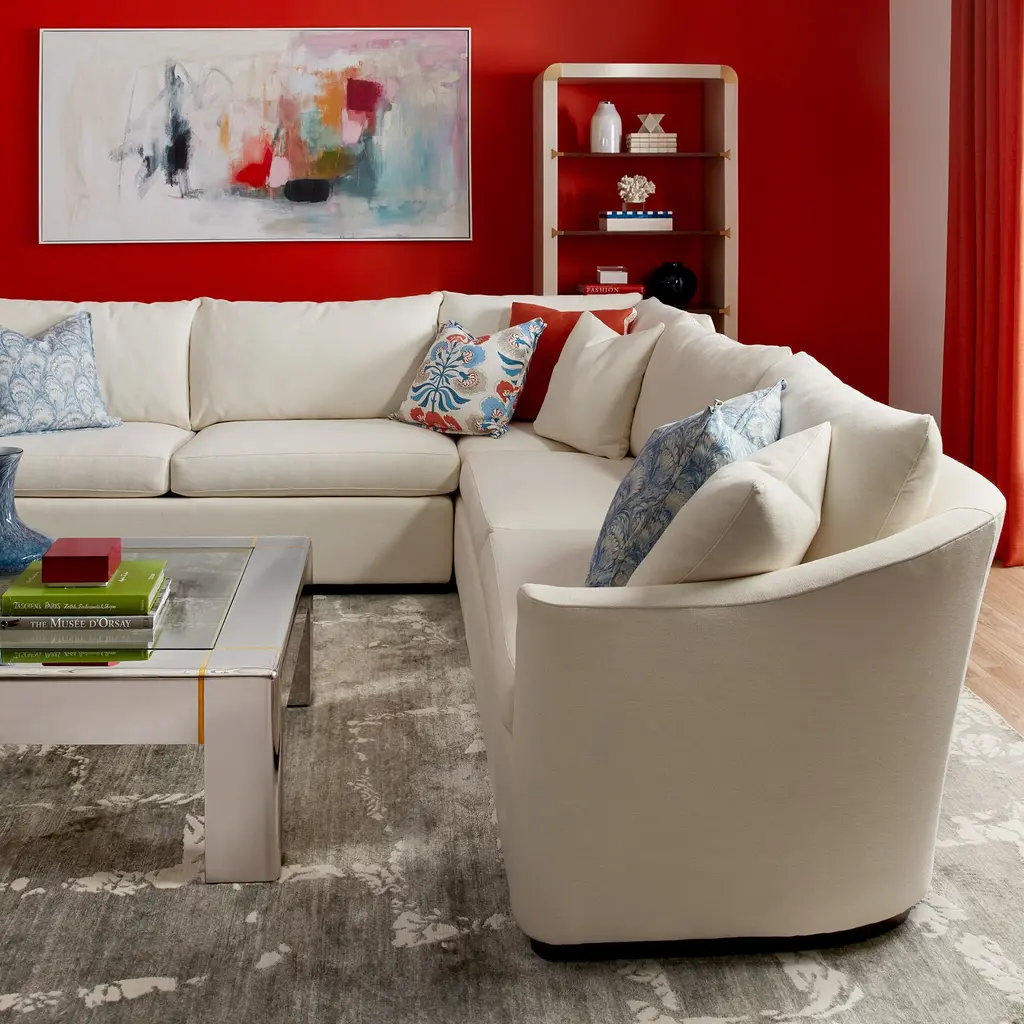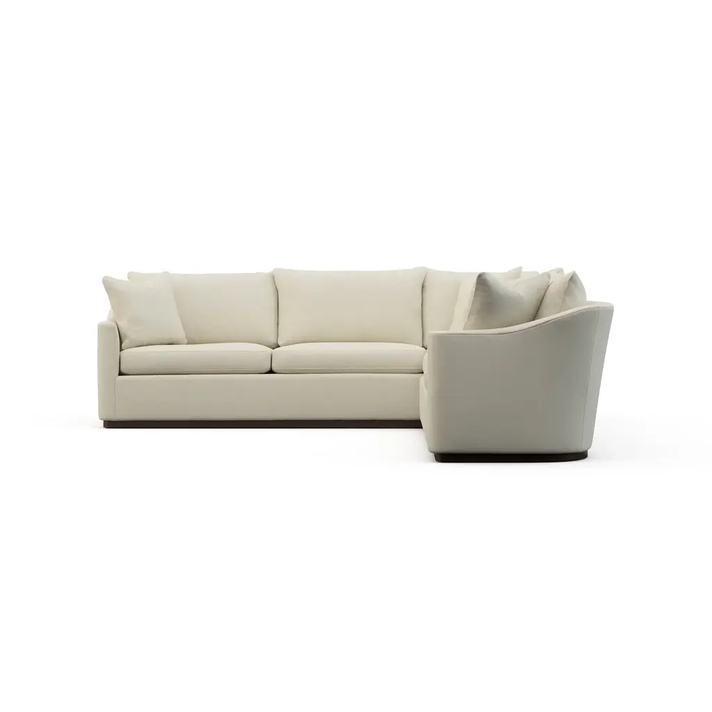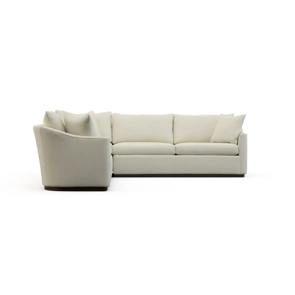 The Kira 2 Piece Sectional is a corner sofa with ample seating for five or more. It's gently sloping arms and unique wooden plinth base give it substance while also ensuring the space feels open and inviting. Ships In 8-10 Weeks Six loose back pillows Five loose seat cushions As Shown Fabric: Rayburn Oatmeal, Lynnwood White (lifestyle) As Shown Finish: Antique Walnut If you choose to purchase COM, once you have placed your order a customer service rep will contact you regarding where to send your fabric. Please note that current lead time is 17-19 weeks once your fabric arrives at the factory, and if unused fabric is under 1.5 yards, it cannot be sent back to you.This product can be special ordered in additional fabrics, leathers, finishes, and cushion fillings. Click here to email us for for additional information about special ordering.This image is for illustrative purposes only. The colors shown are accurate within the constraints of lighting, photography, and the color accuracy of your screen.