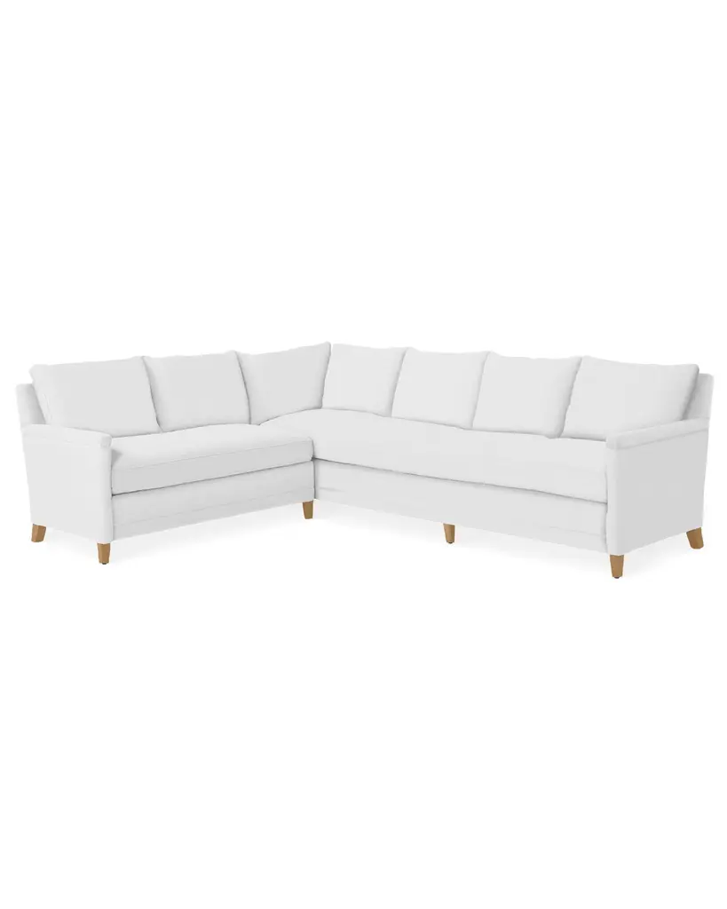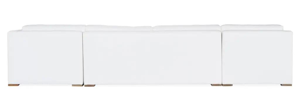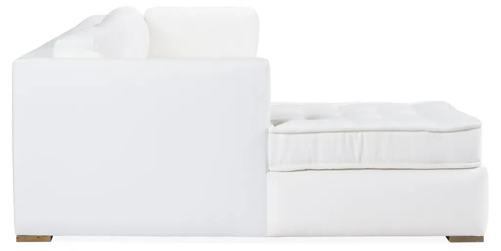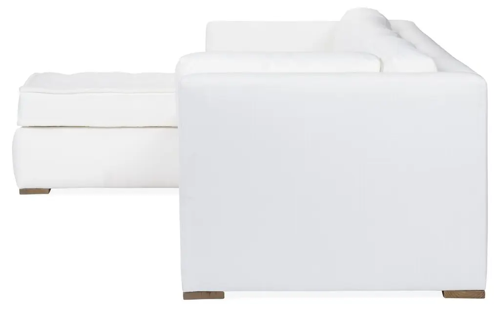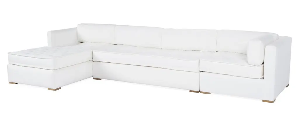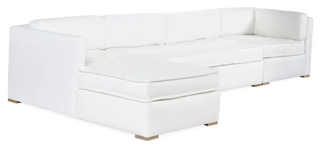Designed by us and available only at One Kings Lane: Framed in reclaimed alder and set on block feet in a natural stain, this three-piece modular sectional is sure to impress guests with its clean-lined silhouette and tufted box-style seat cushions. Each module is upholstered in a durable woven fabric that mimics the look and feel of linen, while an ample fill of foam wrapped with Dacron and Trillium ensures long-lasting comfort. We love how this versatile piece can be reconfigured to fit your space.